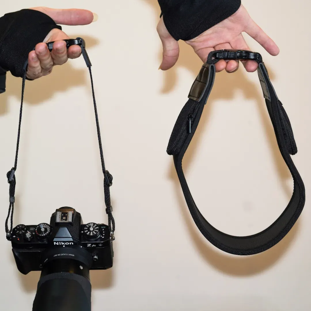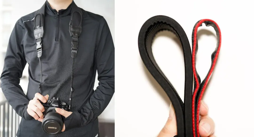 原厂肩带单薄僵硬,常让摄影人“负重前行”,长时间背负对颈椎也是不小的压力,要知道单反+镜头的重量常常会超过5斤。所以,选一条好用的减压肩带是关键。