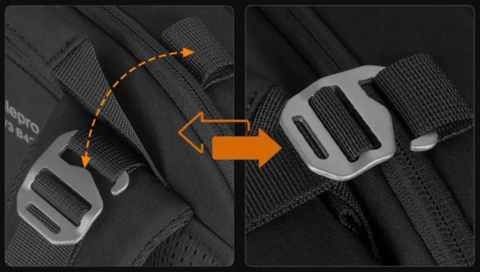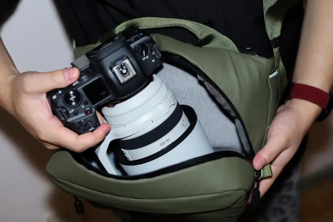 这是新推出的摄影包,我们已经体验了几周了。别看外观简约普通,但设计上很用心。此前很多用户担心的拉链承重问题也得到了解决,创新肩带上下调节,背负或者行走时可以把肩带扣扣在背包顶部,这样就可以很大程度减小拉链的压力。