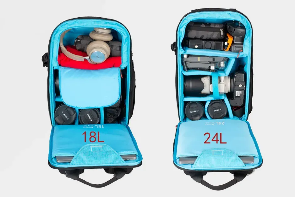 这次这款包提供两个容量版,18L和24L。依旧采用上下分仓,但设计得比灵活(活页粘贴设计,大些的镜头也能放)【18L容量】1机3镜+随身配件+16英寸内超薄笔记本;【24L容量】1机5镜+随身配件+16英寸内超薄笔记本;