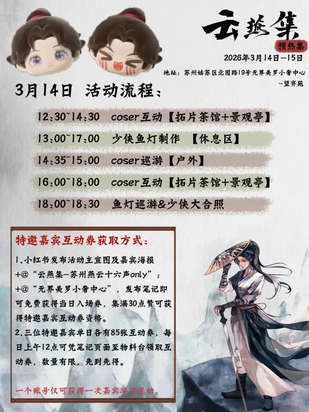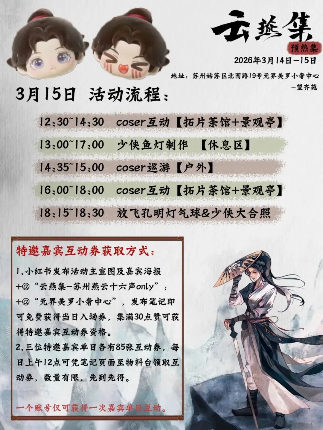 为延续女神节活动热度,本周六、周日(3月14日、15日)小奢中心还将举办“燕云十六声”二次元活动,Coser互动、少侠鱼灯制作,更有Coser巡游、放飞孔明灯气球等震撼场景,游戏玩家、游客皆可参加。