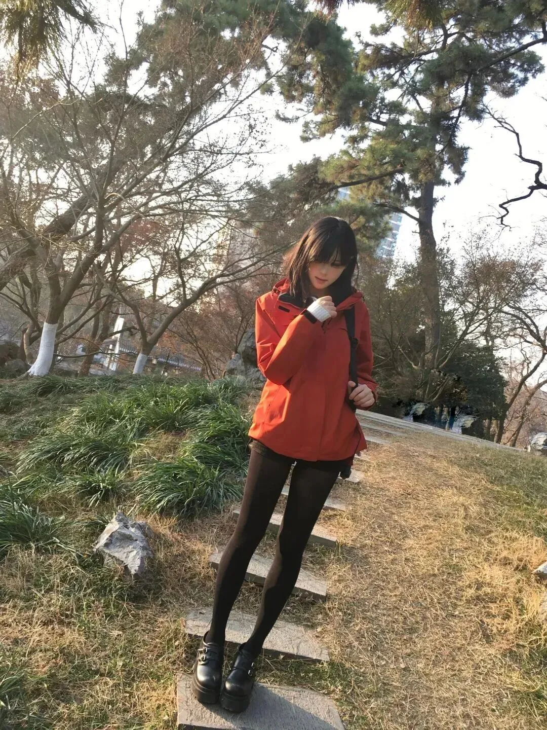 第一种穿法就是甜中带点帅。穿着铁锈红冲锋衣搭配黑色紧身裤袜、穿着厚底乐福鞋的造型立即给人造成了一种学院风加户外的感觉。背负一个黑色背包,既实用又好看,具有很强的层次感。