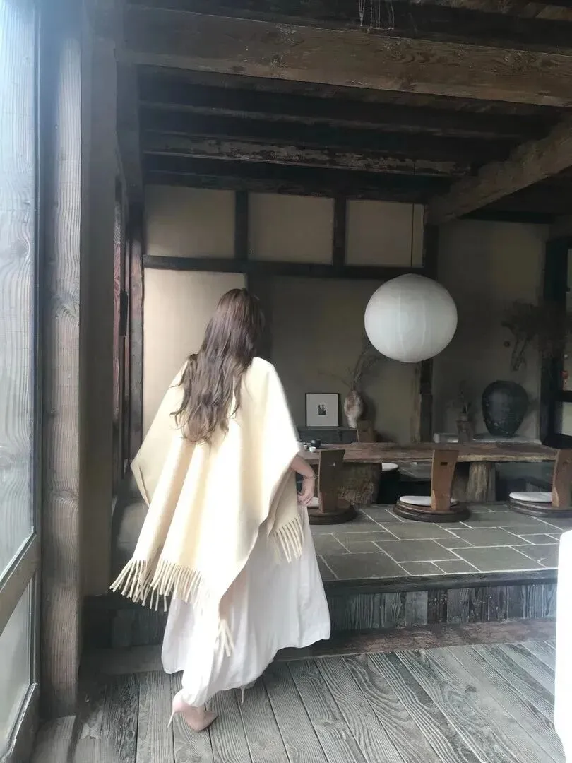 家里有中式风格的地方就试着穿一件米白色带褶的蕾丝上衣,再披一条浅米色的披肩。挂着一条项链,珍珠,颈项上的曲线就会突出来,温文尔雅的气质立即被体现出来了。蹲在地面上或者坐在木板地上所引起的那种心灵的震惊美,它是宁静的。披肩的流苏加上中式背景超配,使得整个人都有一种故事感。
