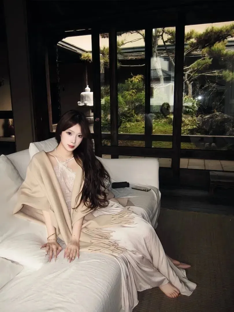 最后坐在软软的白色沙发上,米白色的吊带长裙配上浅卡其羊绒披肩,流苏垂在脚下,整个身体就显得很安静很柔和了。简约的穿搭能够突出一个人的温柔气质,不需要很多的装饰也可以表现出这种质感。