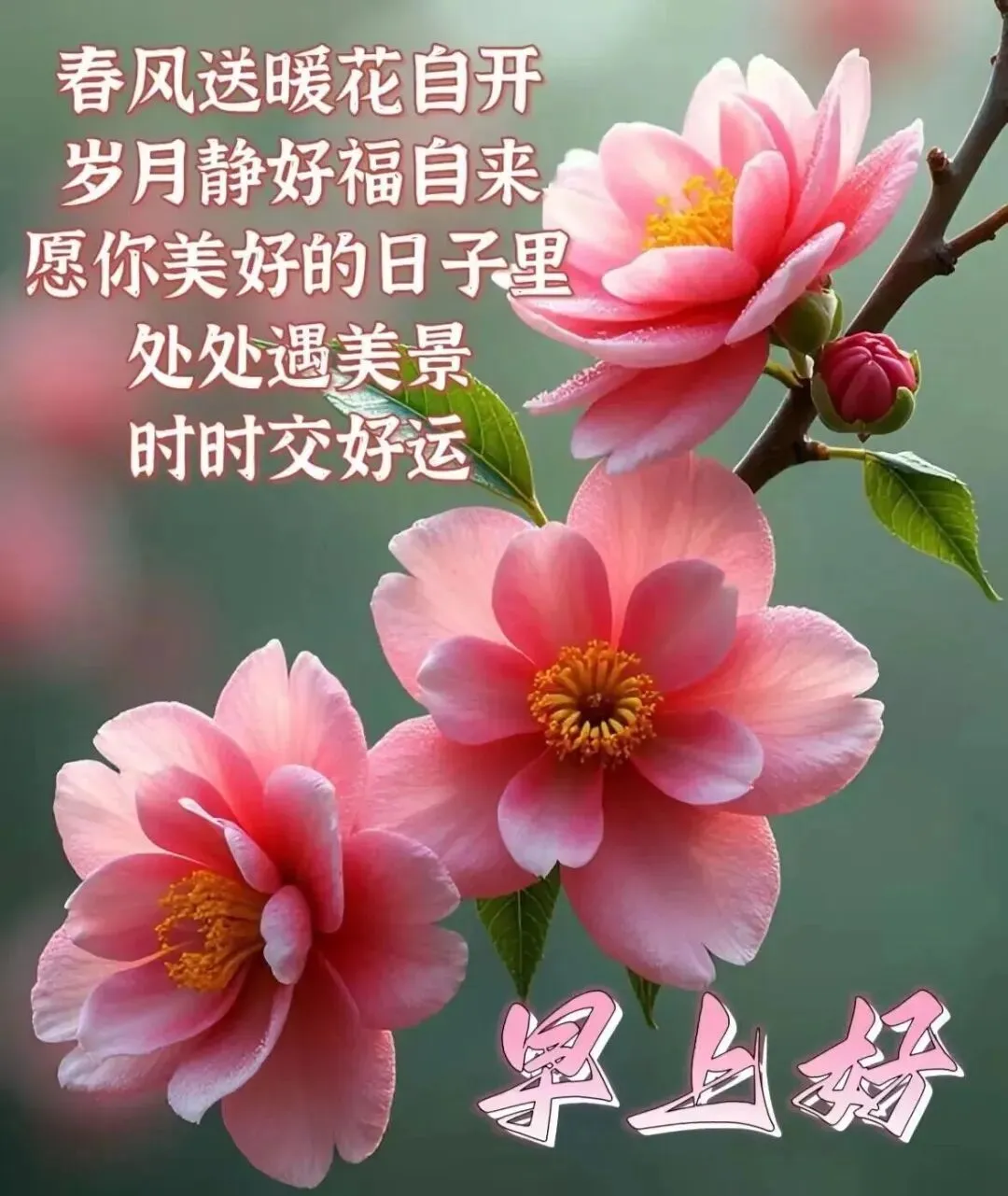 人间最是三月好,蝶舞蜂飞柳色鲜;碧水环山花竞放,和风丽日醉人间;清晨捎去我祝愿,愿您欢欣每一天。早安!
