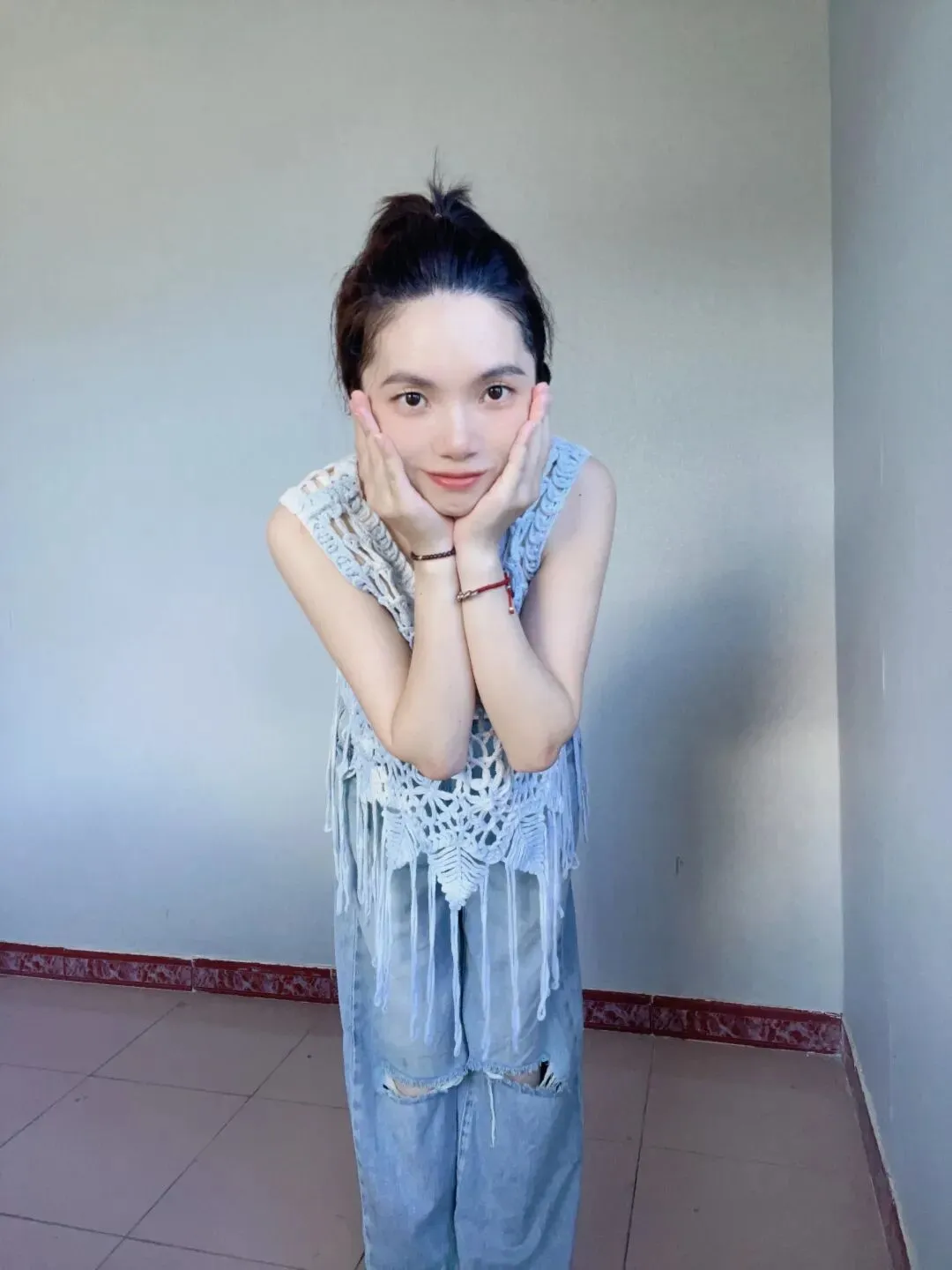 我带着满心疑惑点开配图细看,才发现不过是一套清爽又治愈的小清新穿搭——上身是一件简约利落的美背,勾勒出松弛的线条,下身是一条复古微喇叭牛仔裤,衬得身姿轻盈又自在,没有一丝张扬,更没有半分暴露,浑身都透着未经打磨的少女感。这样干净又舒服的模样,怎么就成了“不配当妈妈”的原罪,怎么就成了被人苛责的理由?
