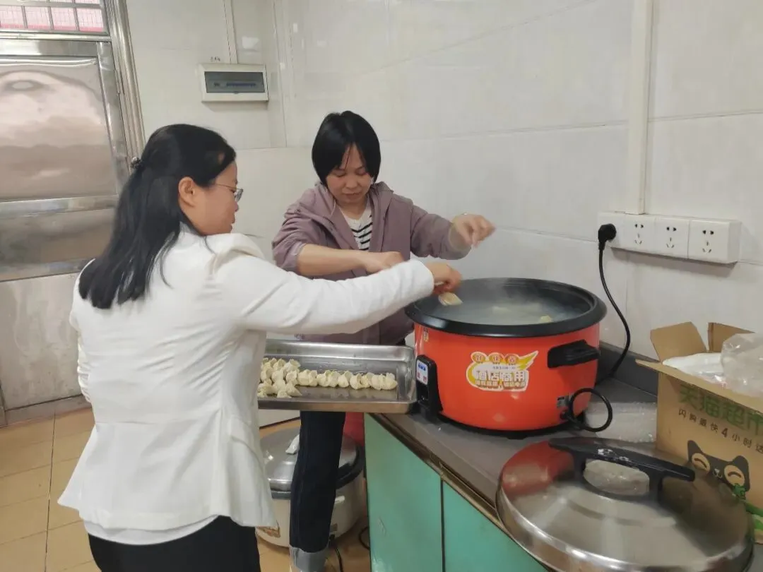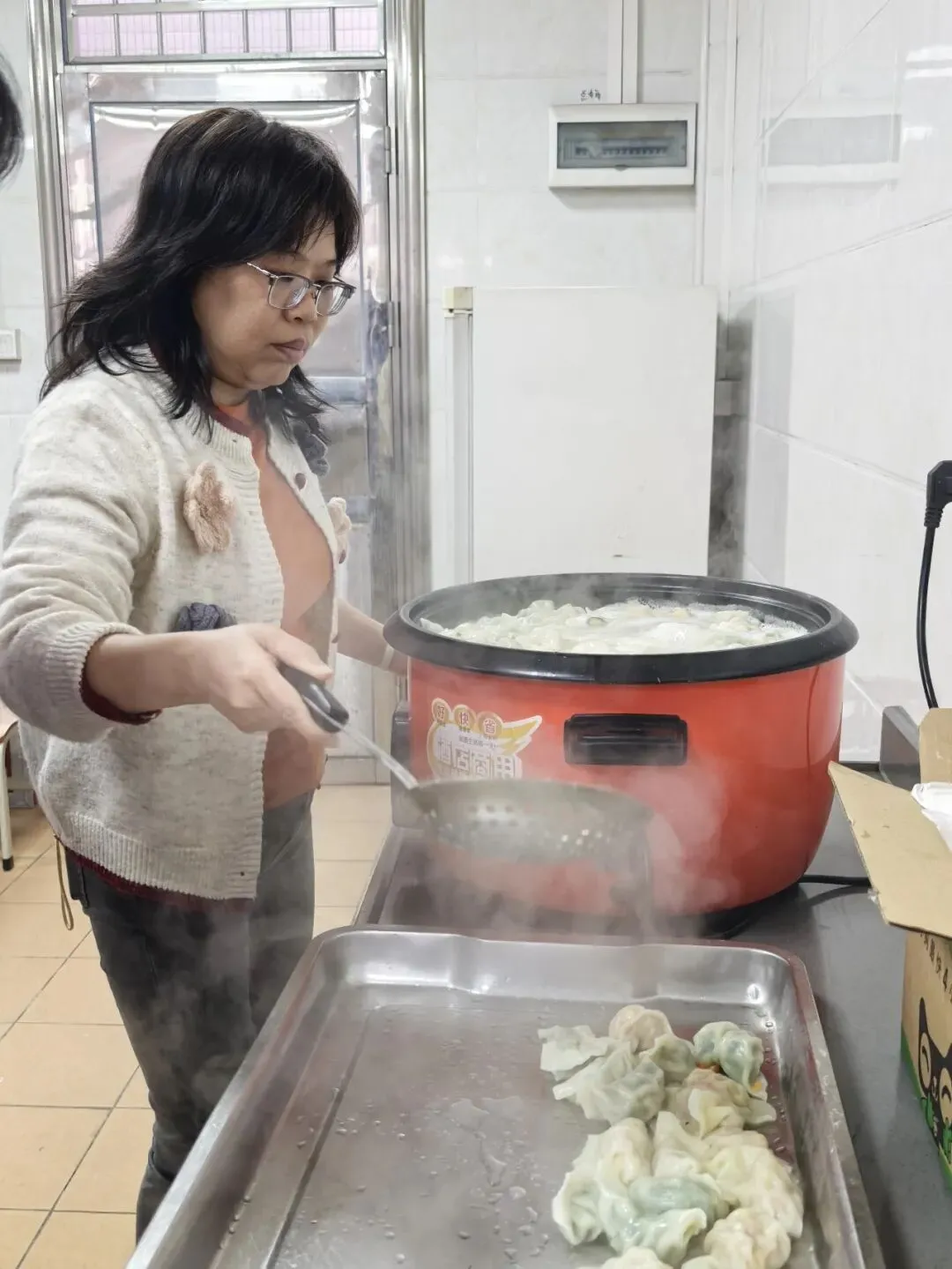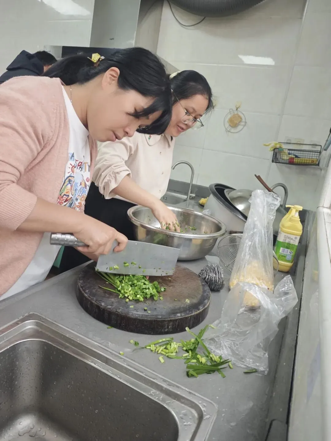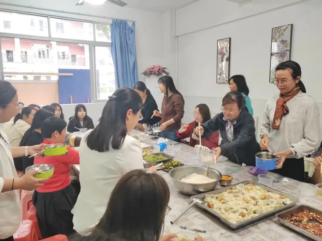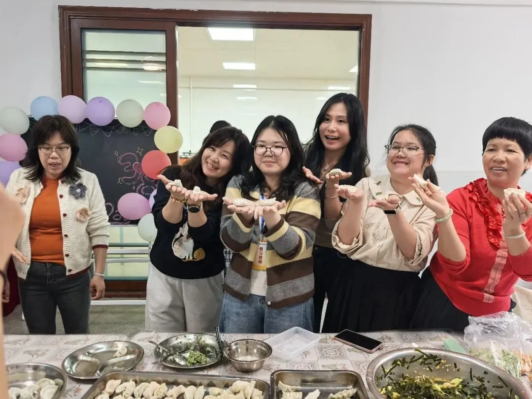 饺子组的老师们分工明确、配合默契,巧妙搭配荠菜、玉米胡萝卜、韭菜等多种馅料,每一种搭配都藏着别致心思,大家填馅、捏褶、塑形一气呵成,一只只饱满美观的饺子,包裹着同事间的温情暖意。