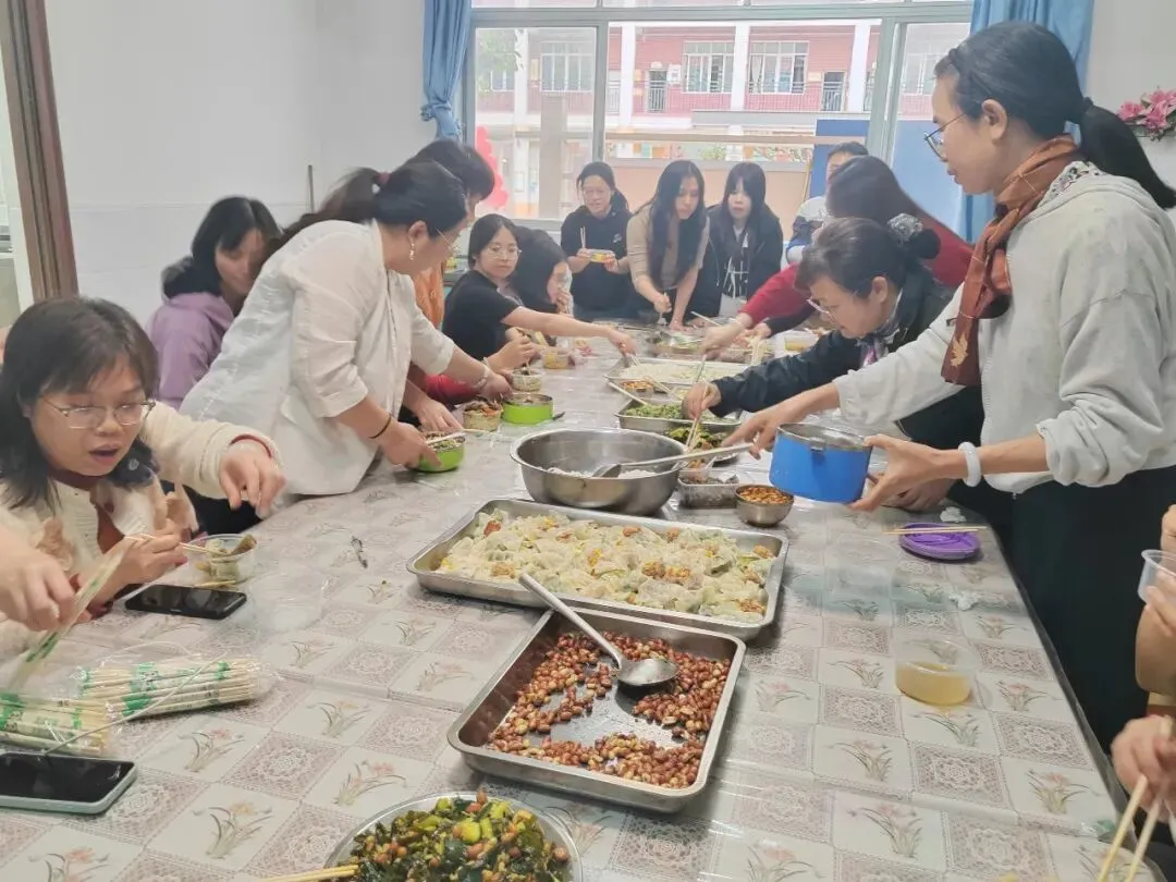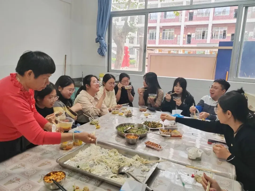 美食制作完成后,全体教师围坐一堂,共同品尝佳肴、分享心得,在香气与欢笑中感受校园大家庭的美好。