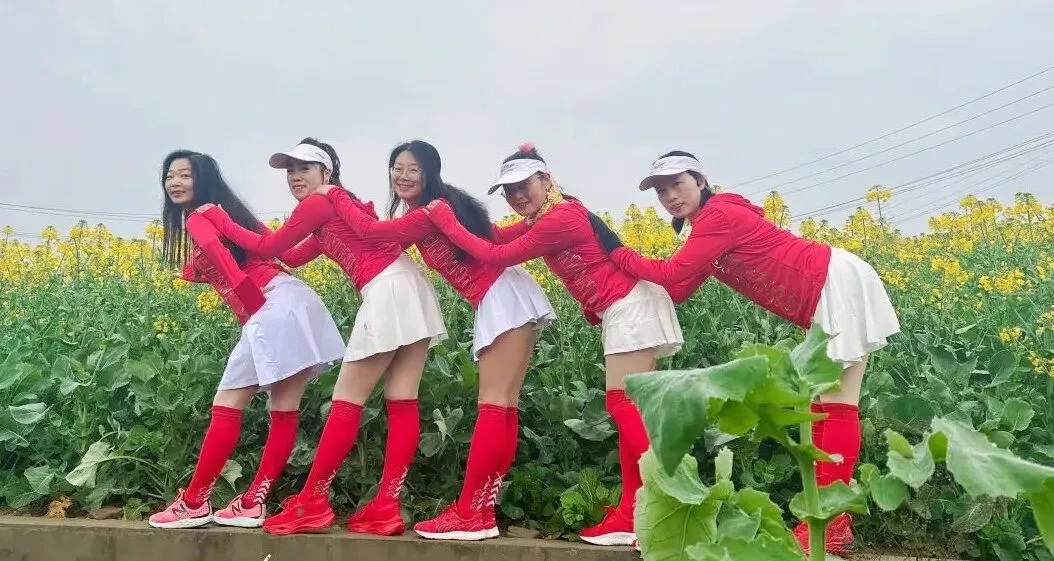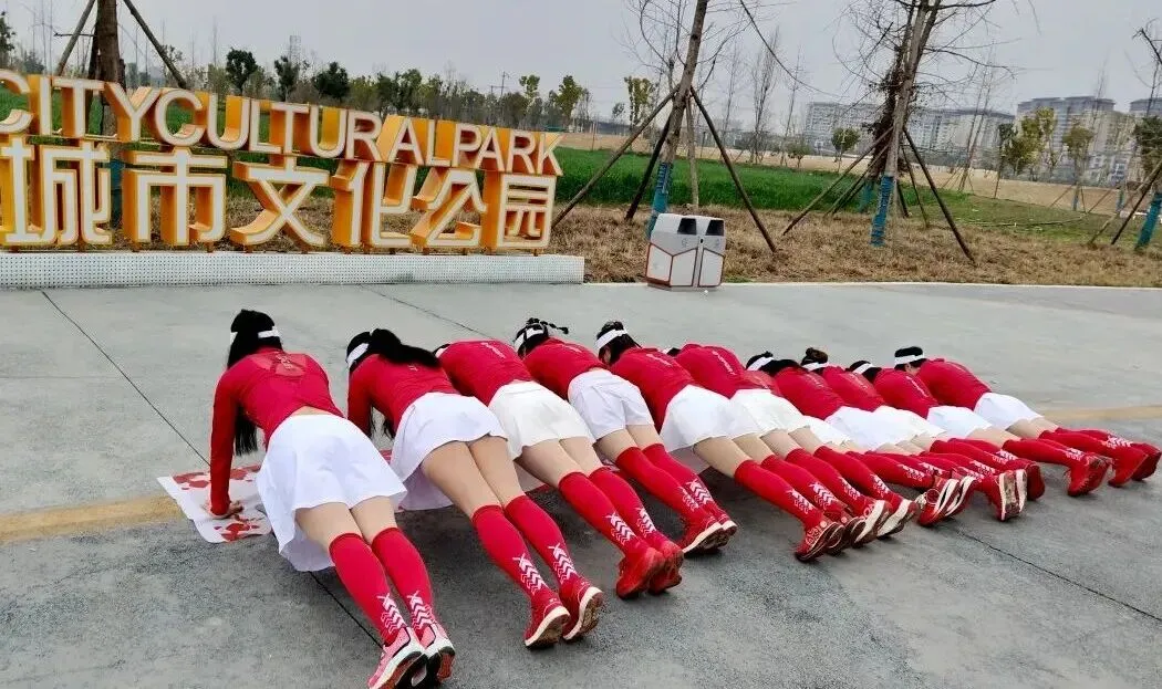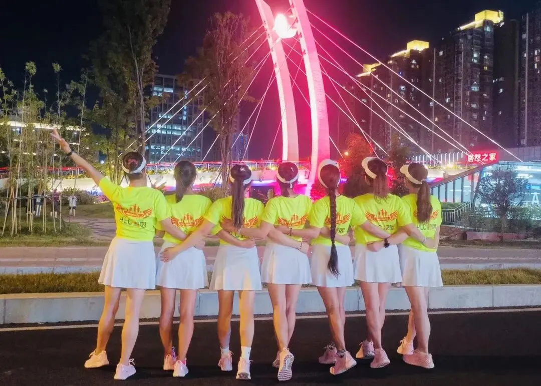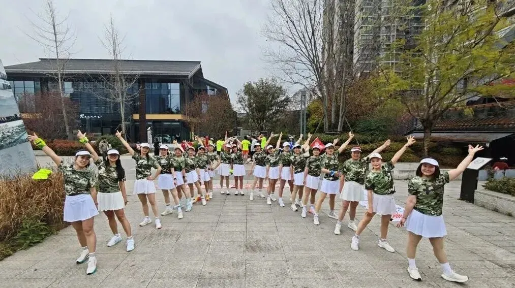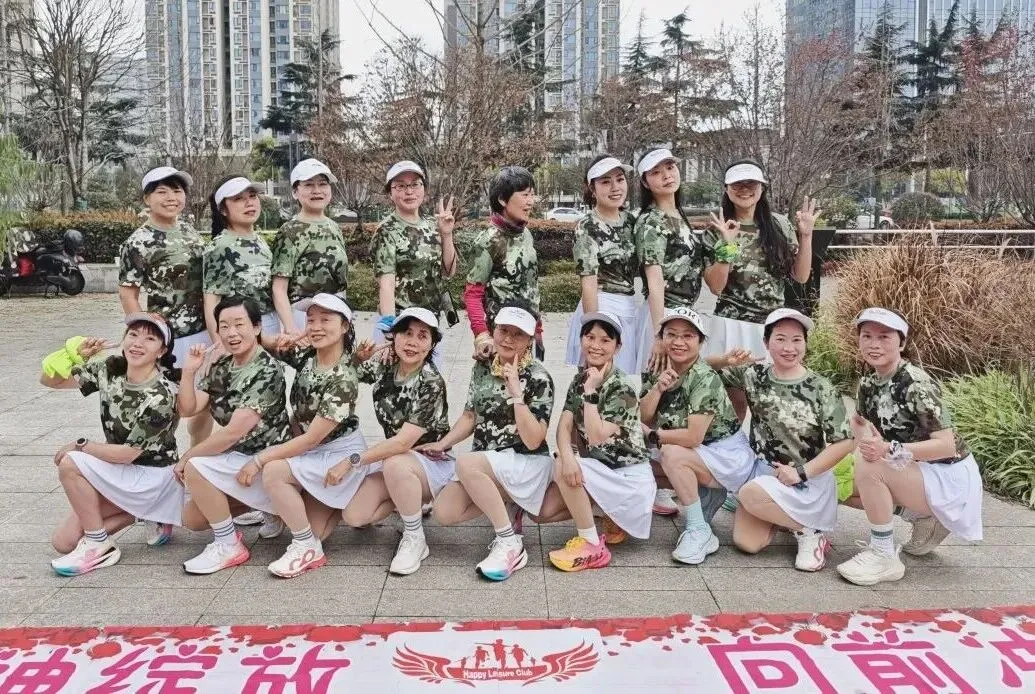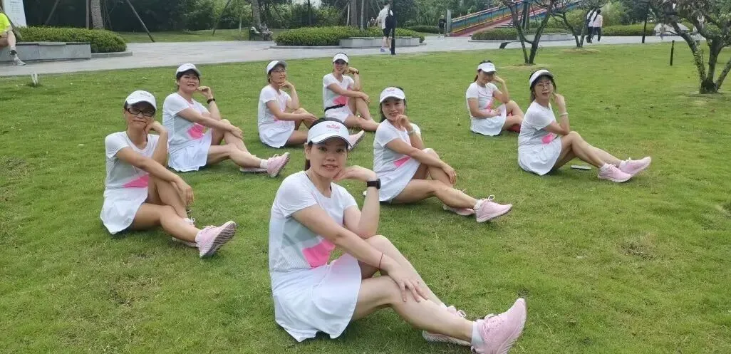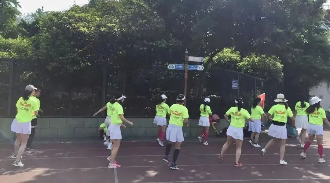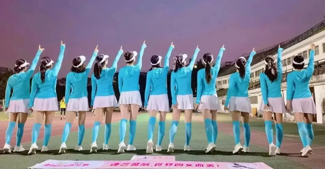 2020年进入疫情期,倡导宅家积极锻炼,女神们积极练健身操,疫情放松时大家出来合练,为更好的展现气质与整体效果,首次统一了白色运动裙作为我团女生团服下衣、后面逐步统一添置女神小分队的运动装备……