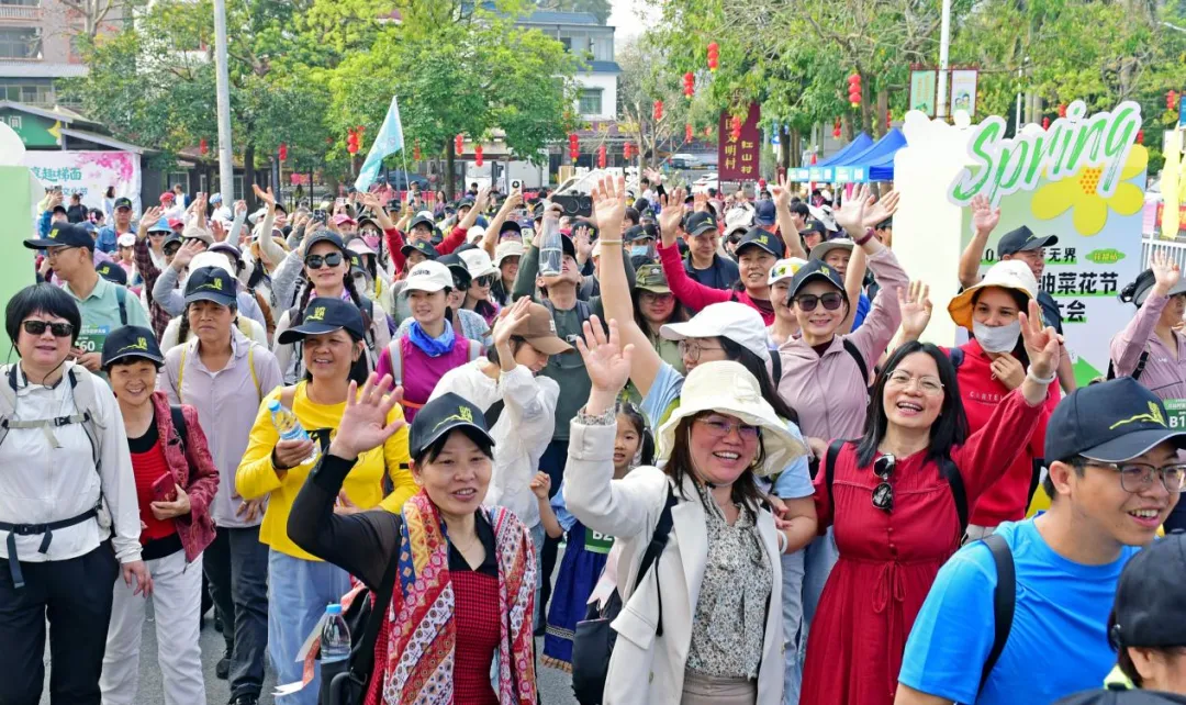 每年三月,梯面红山村的数十亩油菜花就会如期绽放,朵朵金花尽吐芬芳,成群蜂蝶花间翻飞,游客们在花丛中穿梭拍照打卡。今年的徒步大会,则是以花为媒,将传统赏花节庆升级为“赏花+运动+休闲”的复合型体验