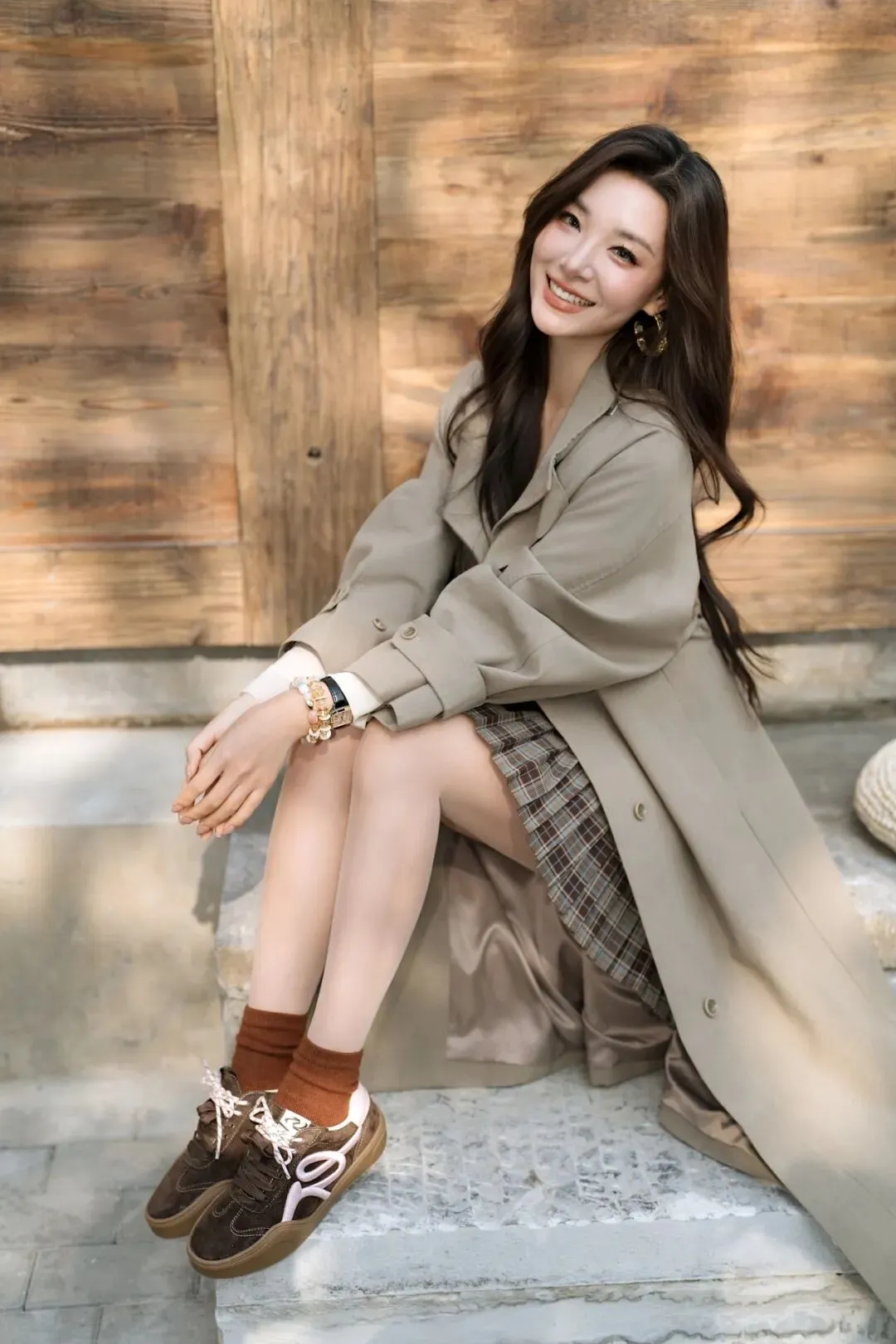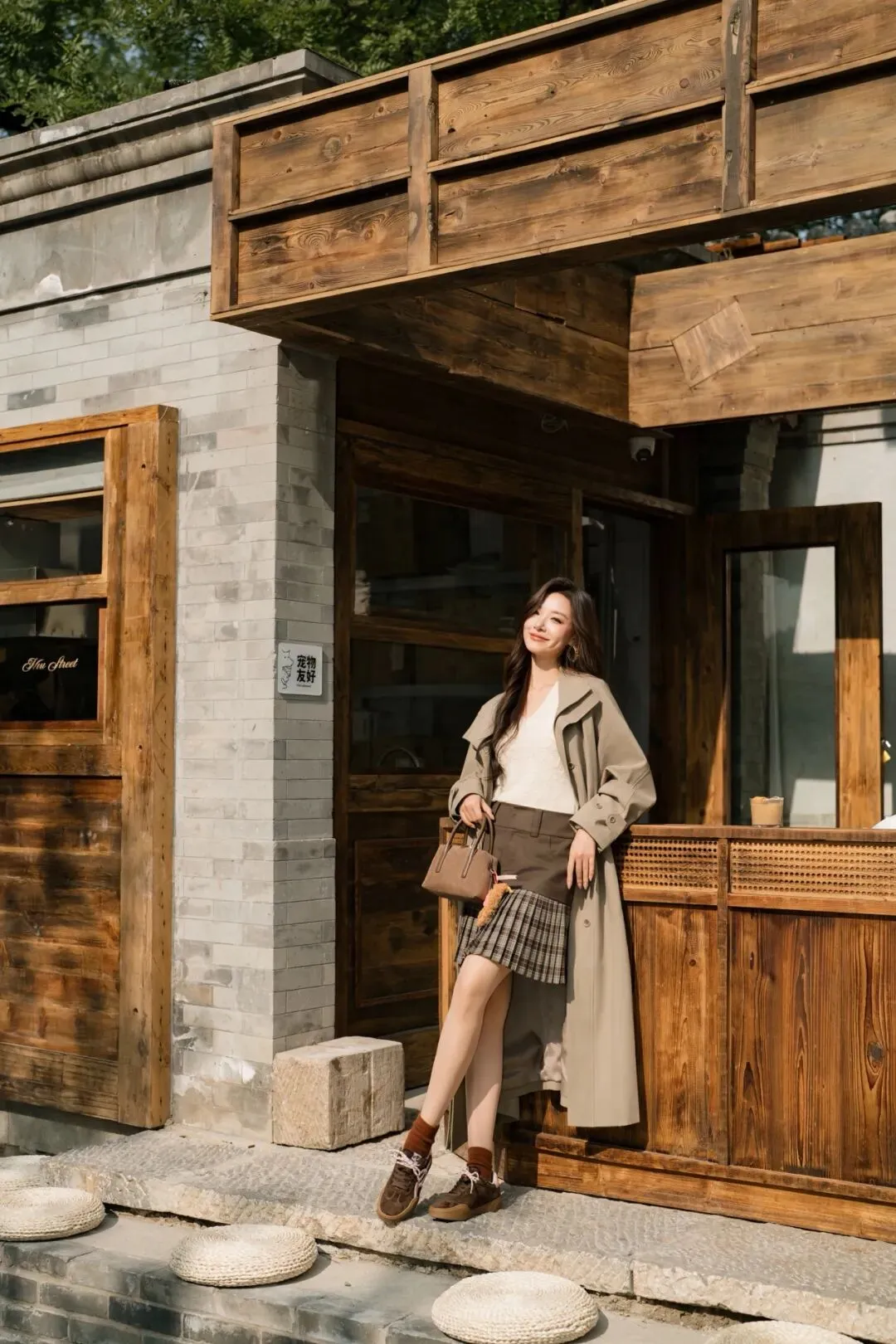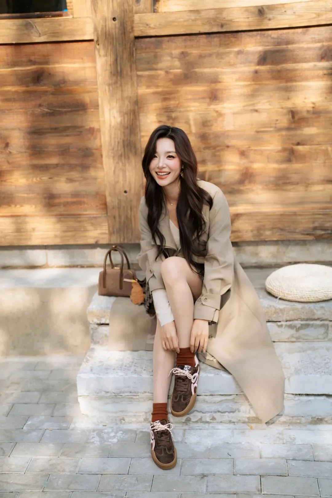 侧身坐在砖阶上,双腿自然搭叠,一手轻搭包包,身体微微侧转,背景是木质栏板,显灵动又有态度,适合抓拍松弛瞬间。