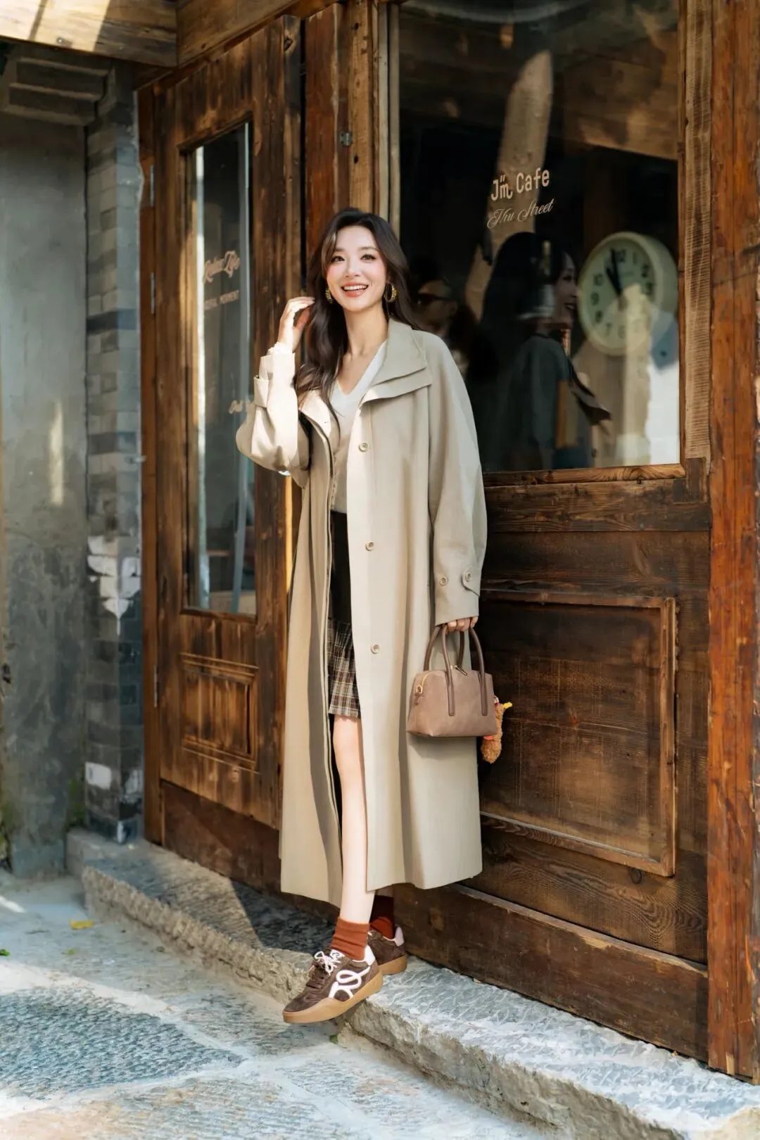 这些姿势围绕浅灰风衣的复古松弛设计,借助棕色手提包增加互动感,结合石阶、木门、木窗、店内桌椅等多元场景,无需刻意摆拍,新手跟着做就能拍出自然好看的复古咖啡馆写真照片。