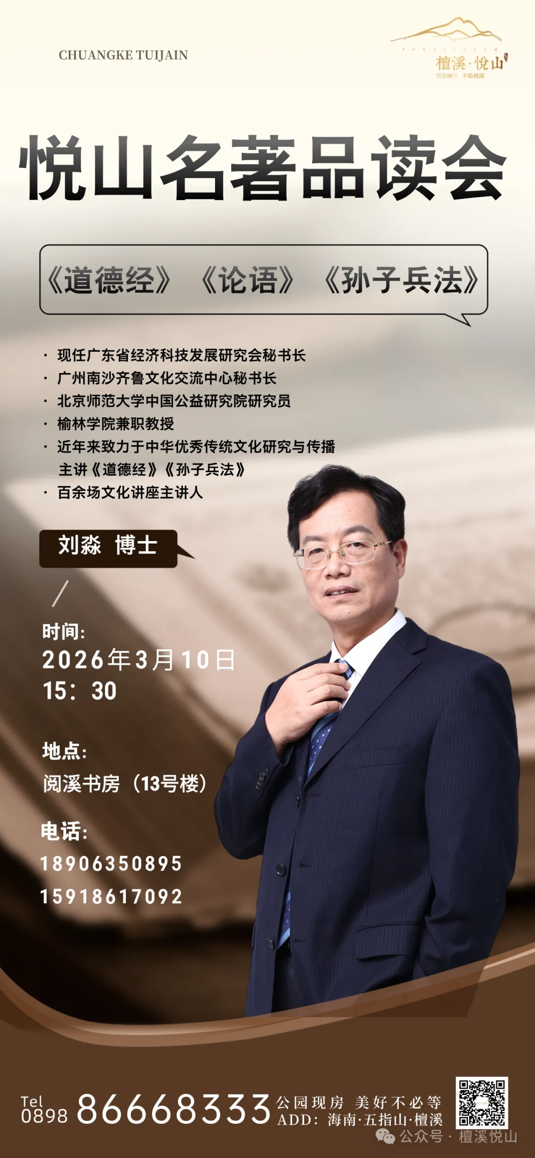 2026年3月10日下午,常宁宗才书院国学导师、广东省经济科技发展研究会秘书长、广州南沙齐鲁文化交流中心秘书长、榆林学院特聘教授刘淼博士应邀作客海南省五指山市“悦山名著品读会”,为邻里品读《道德经》《论语》《孙子兵法》。