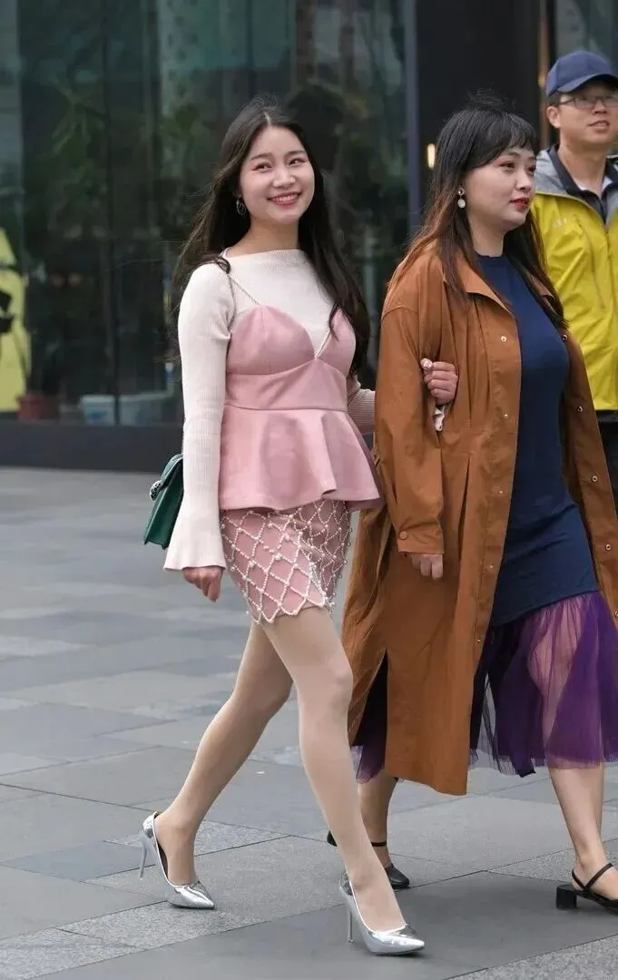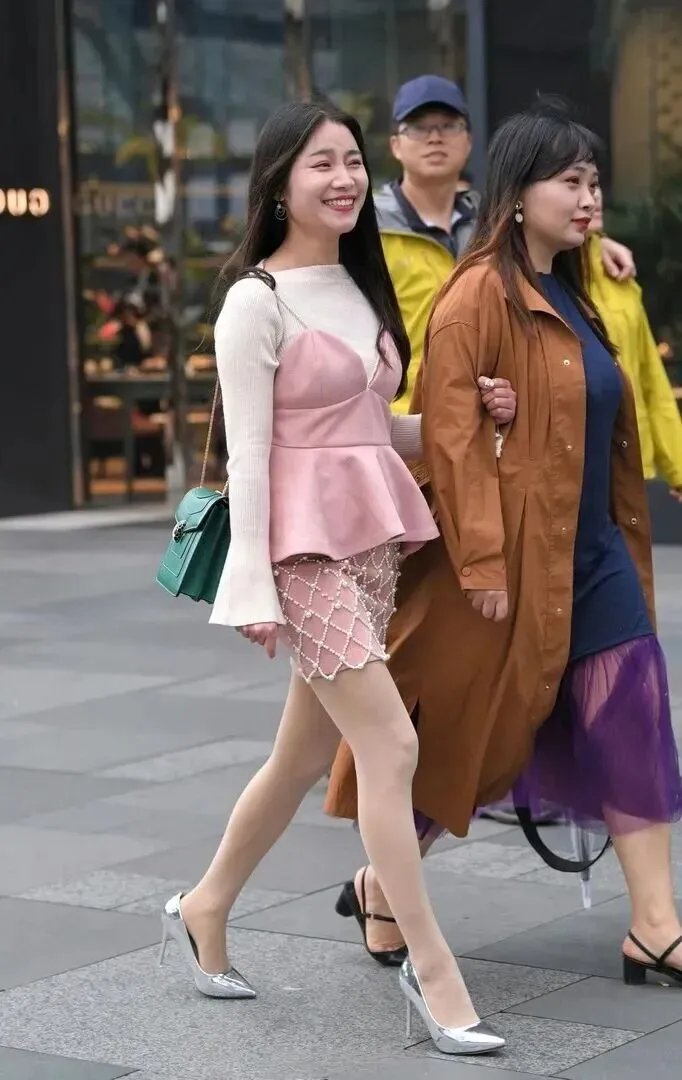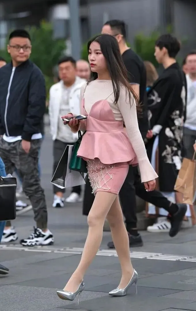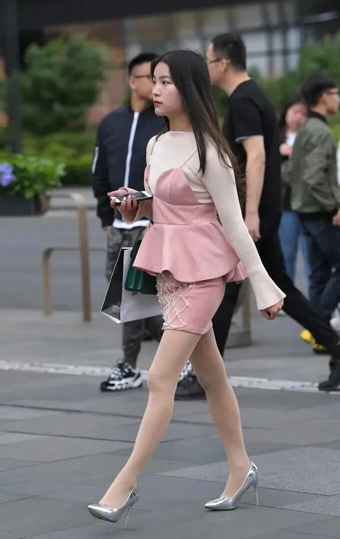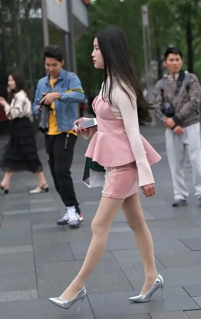 鞋子、丝袜的搭配很巧妙。她穿了一双银色尖头细高跟鞋,鞋跟细细的,视觉上把腿部线条拉长很多。丝袜颜色为肉色,使腿部皮肤看上去光滑自然。同色系延伸效果,小个子女生穿显得更高。