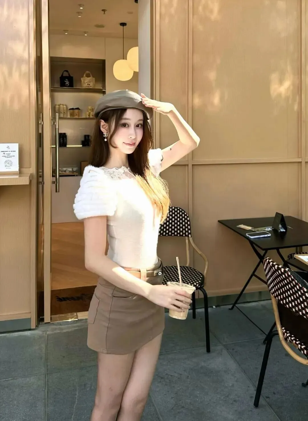 白色的蕾丝领上衣细节好,温婉大方。搭配卡其色短裙,显高显瘦一个。手里拿着一杯咖啡,在街上慢慢地走着,阳光洒下来的时候,整个身体都在发光。这样的穿搭拍照超级上镜,怎么拍都好看,日常出门方便!
