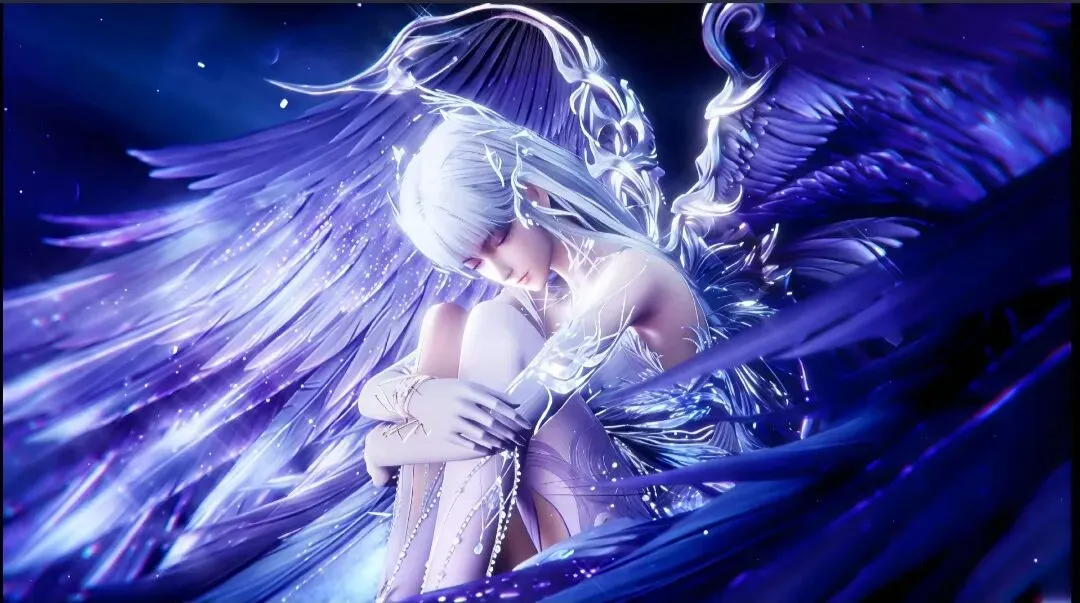 而在成神之后,她的造型再度进化,不仅换上了更为华丽的紫色衣裙,长发也变为了白色,身后还生出了一双巨大而华美的紫色翅膀,手持死神镰刀,气场全开。