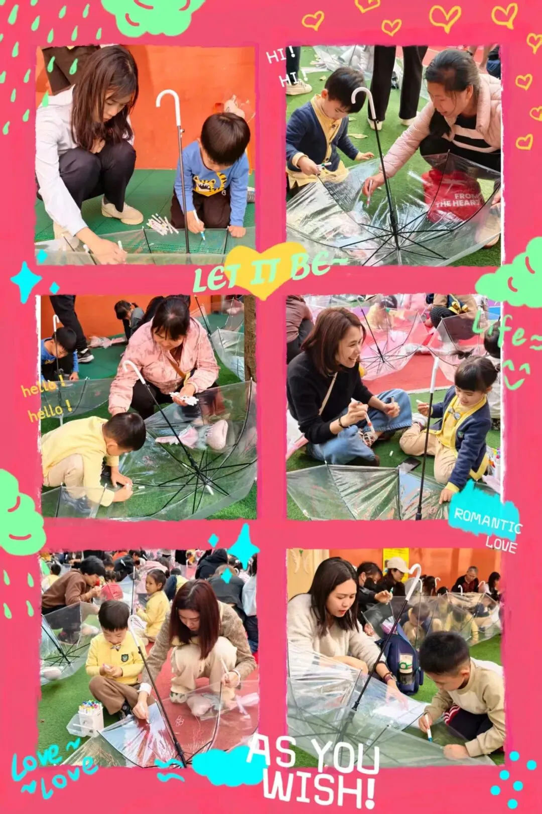 最温馨的时刻,莫过于亲子间的默契协作。在“手绘春日雨伞”环节,孩子们和家长围坐在一起,手持画笔,在空白的雨伞上尽情创作。画笔在手中飞舞,爱意在画纸流淌。家长们耐心地指导孩子,孩子们认真地配合家长,欢声笑语充满了整个操场。一把把原本普通的雨伞,在亲子的共同创作下,变成了独一无二的“爱之伞”,也撑起了孩子们对家人最真挚的守护。