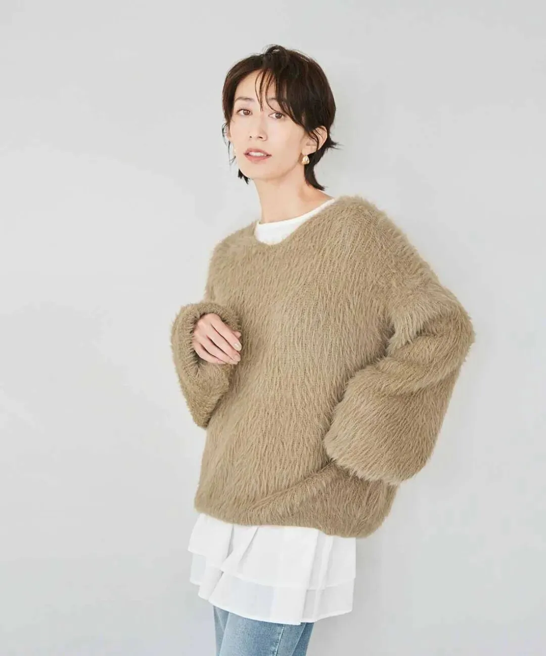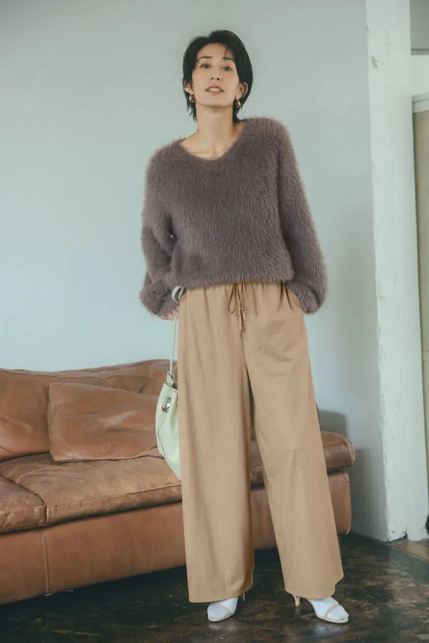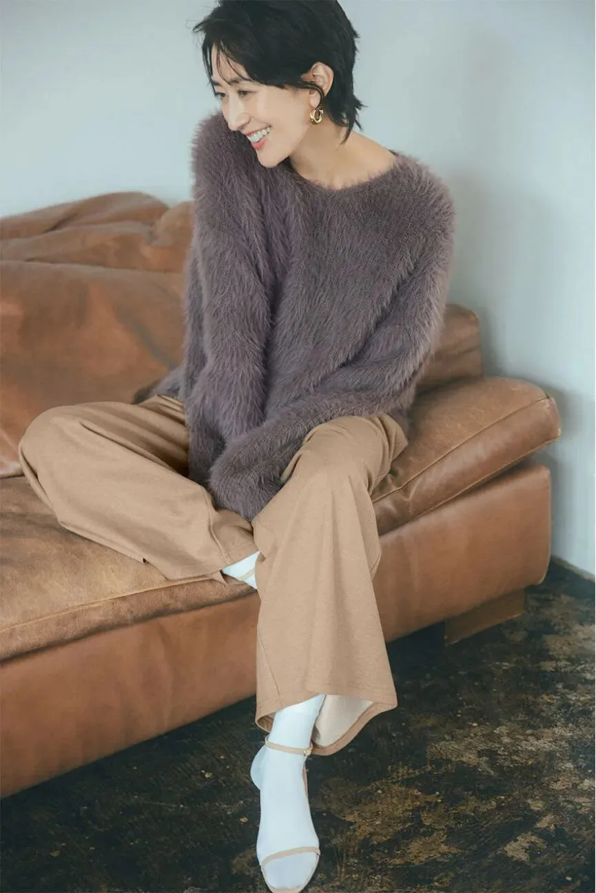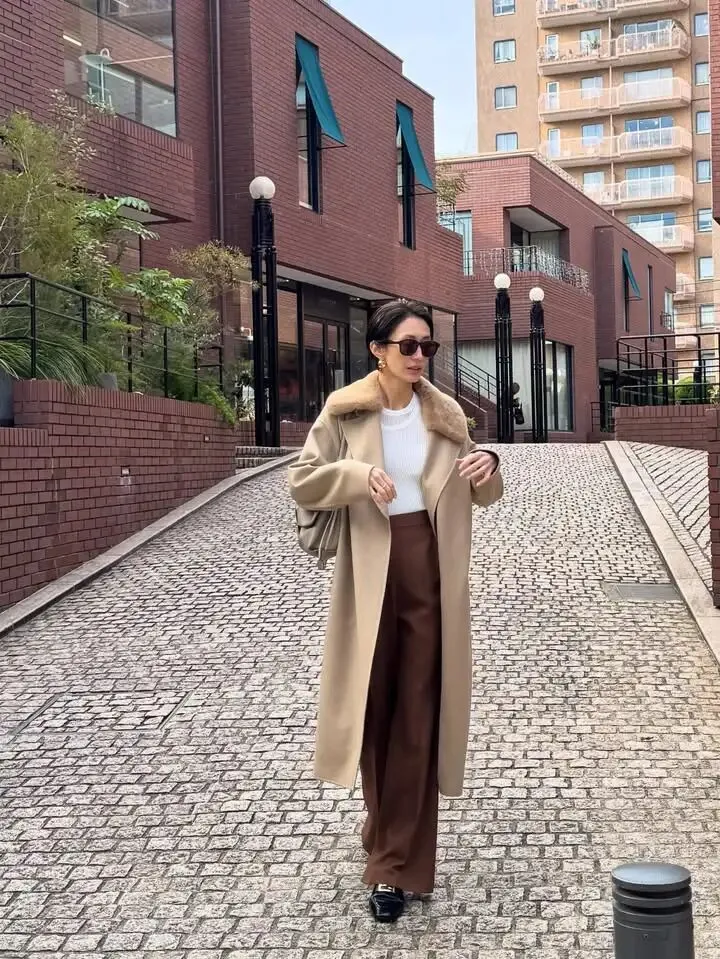 棕色毛衣带有毛绒绒的温暖触感,就像小动物般可爱。搭配卡其色裤子,既有知性气质又不失亲和力。