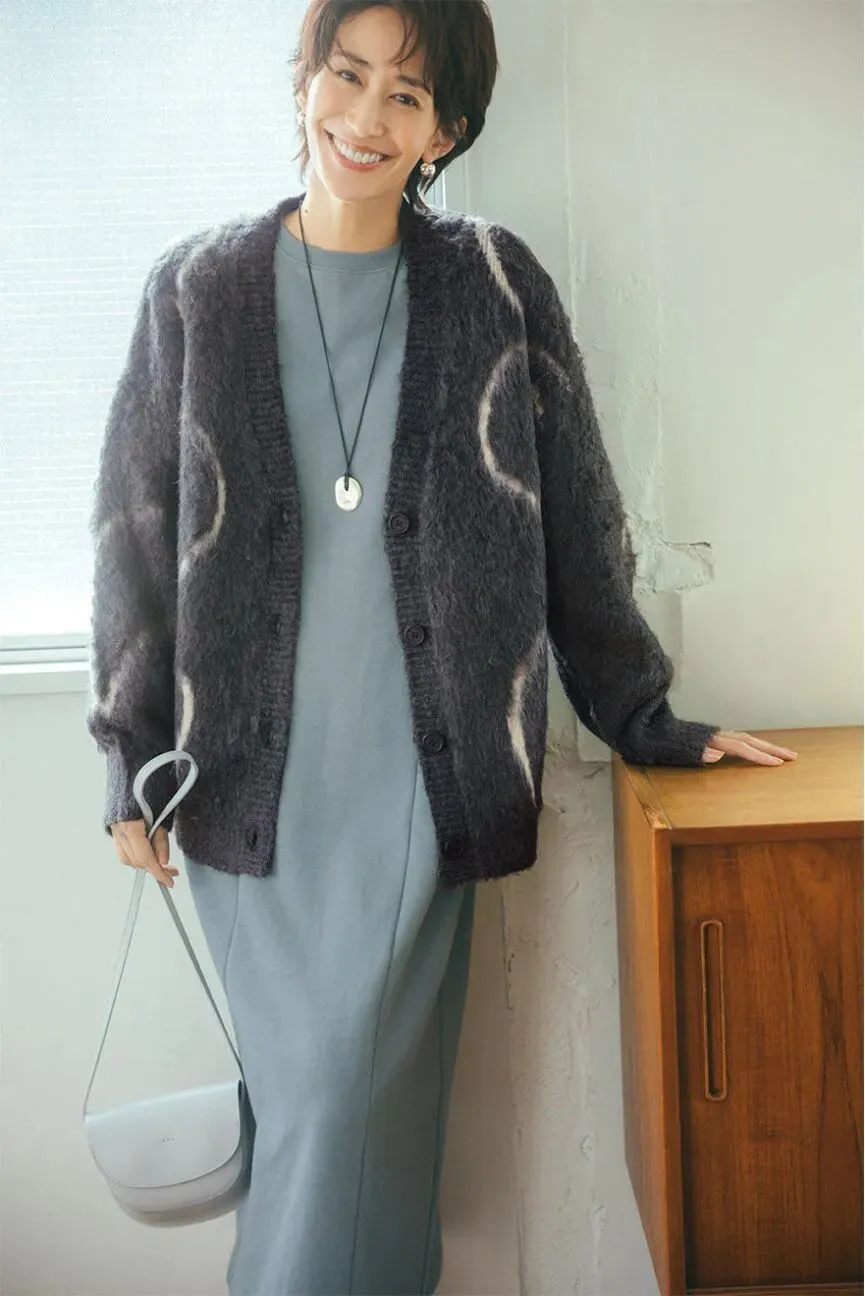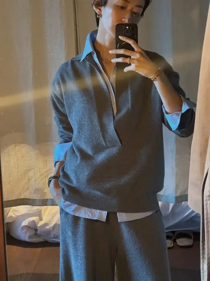 深灰色针织衫沉稳内敛,呈现出一种中性、平衡的视觉效果。内搭同样冷静的蓝色,能让人在视觉上感受到一种从容不迫的态度,特别适合职场或正式场合。
