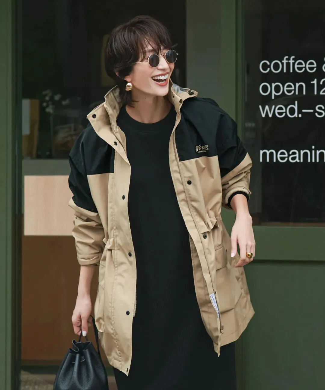 卡其×黑色拼接的户外风外套,大地色系自然不挑场合,实现山系穿搭与城市通勤的无缝链接。