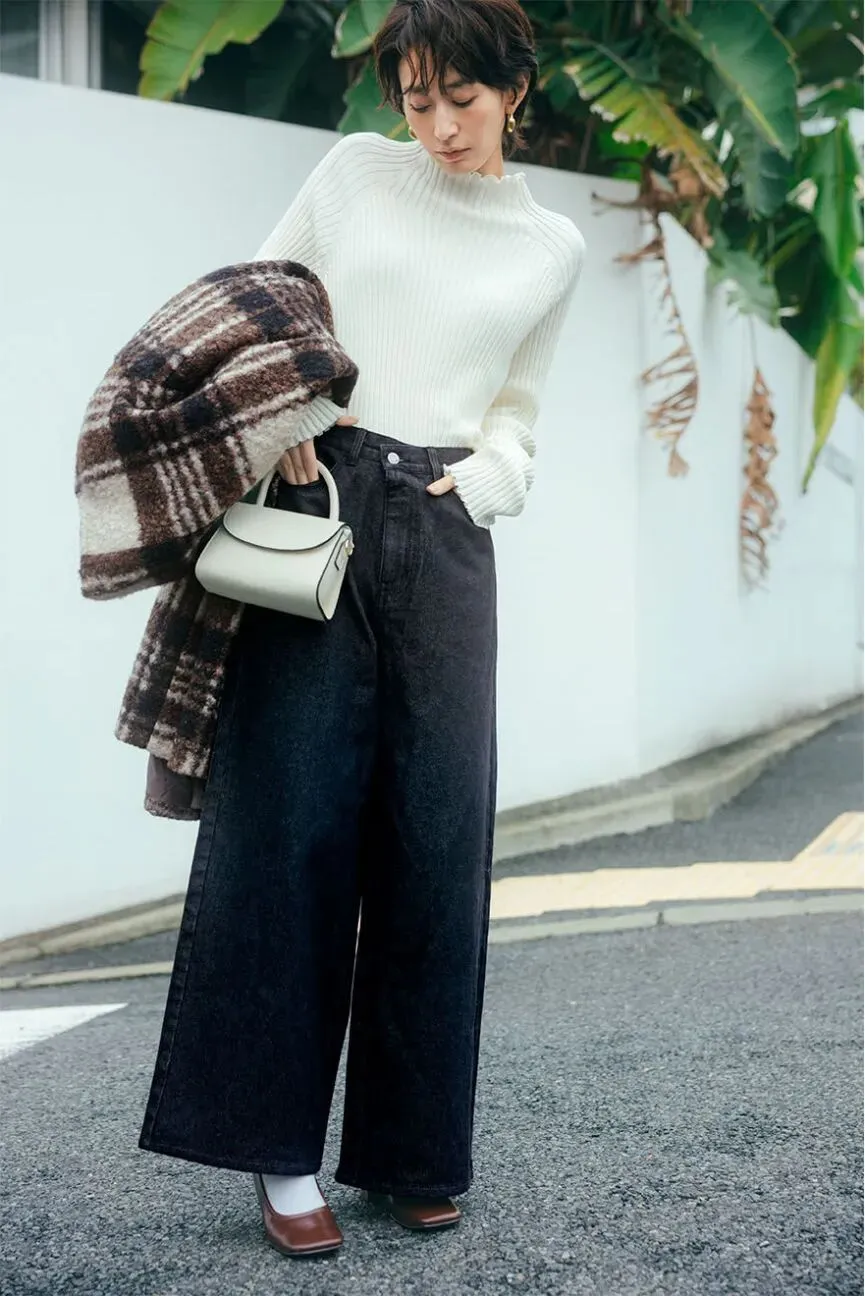尽管是高领毛衣,却因为白色能够打破沉闷感,让整体更清爽耐看。搭配质感挺括的牛仔阔腿裤,凸显出飒气的风格。