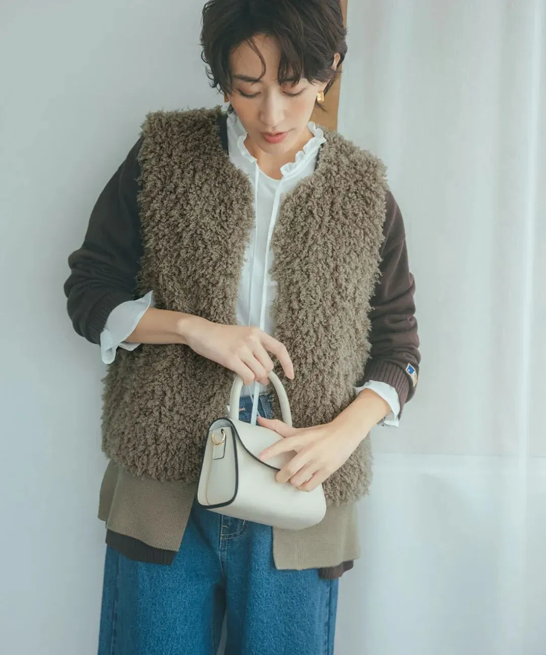 毛绒绒的背心保暖性强,同时因无袖设计不会显得厚重,适合叠穿搭配。下身选择牛仔裤,怎样都不出错。