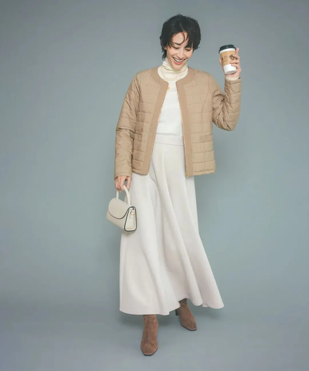 无领夹克摆脱了传统领型的束缚,通过简洁剪裁释放颈部线条,视觉上更显轻盈。优雅卡其×清爽白色,组合起来气质非凡。