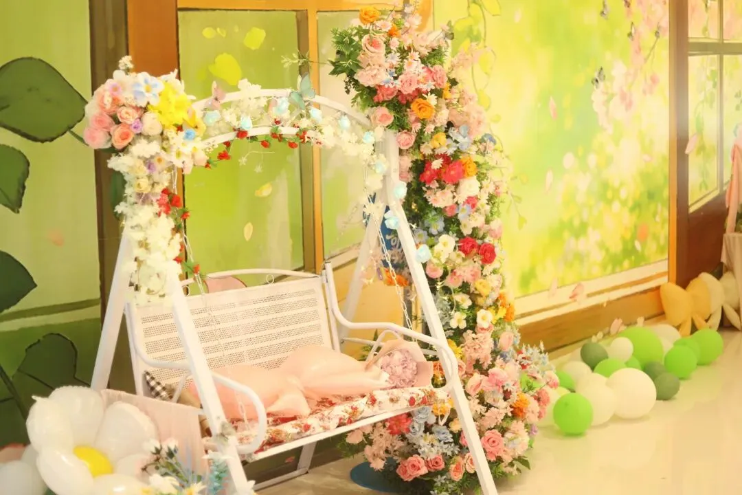 鲜花秋千、粉色布置已就位