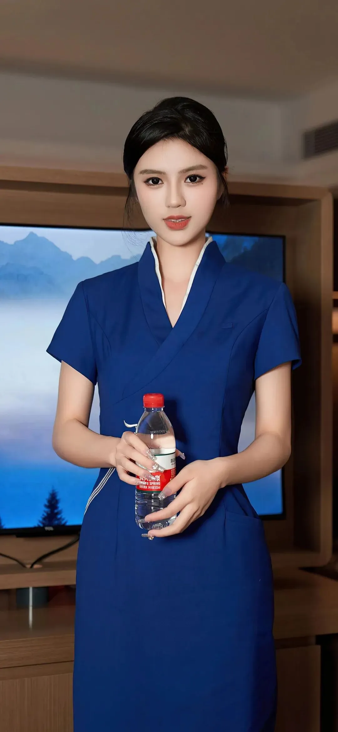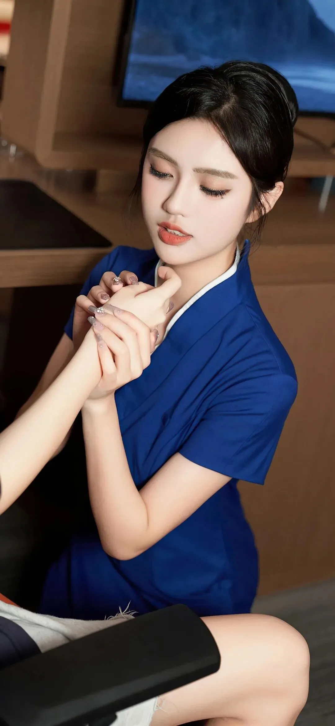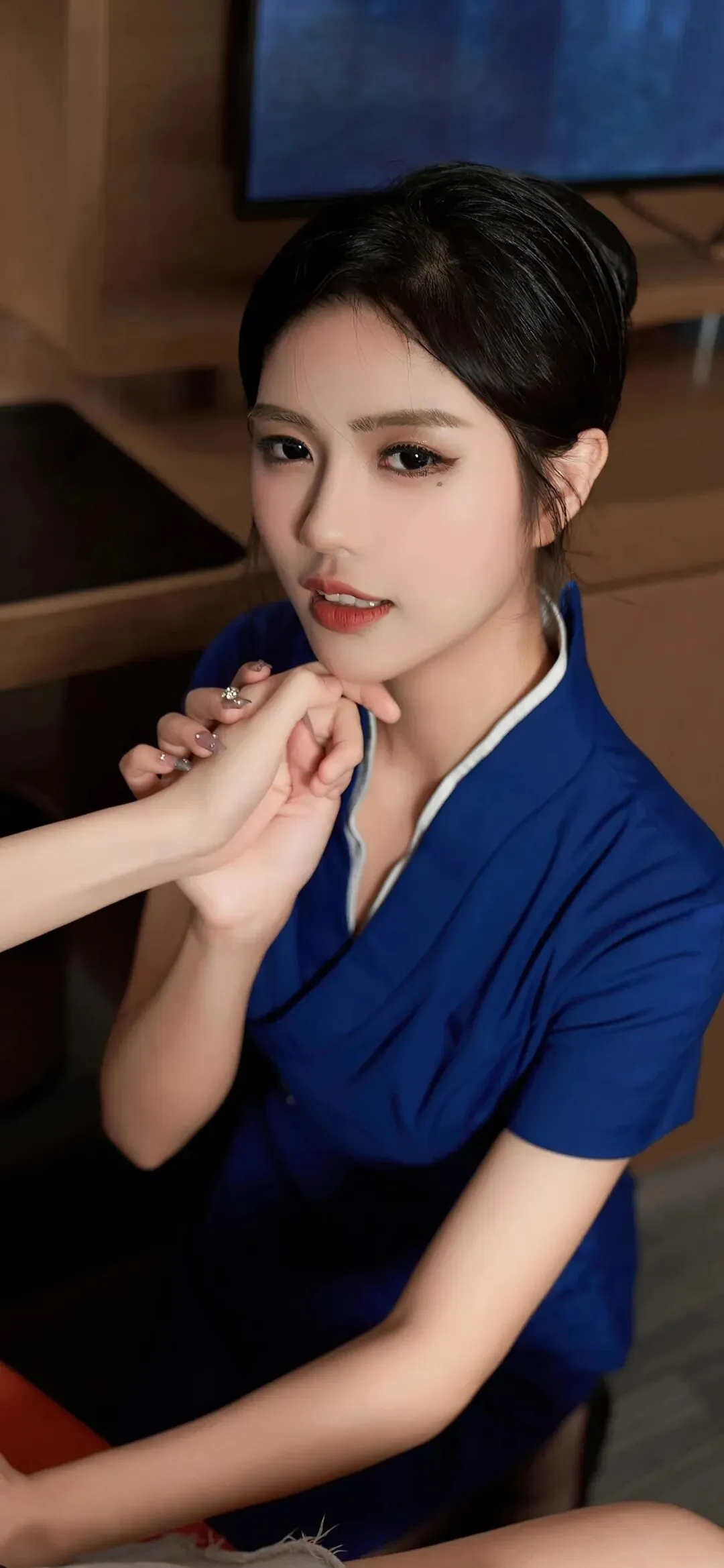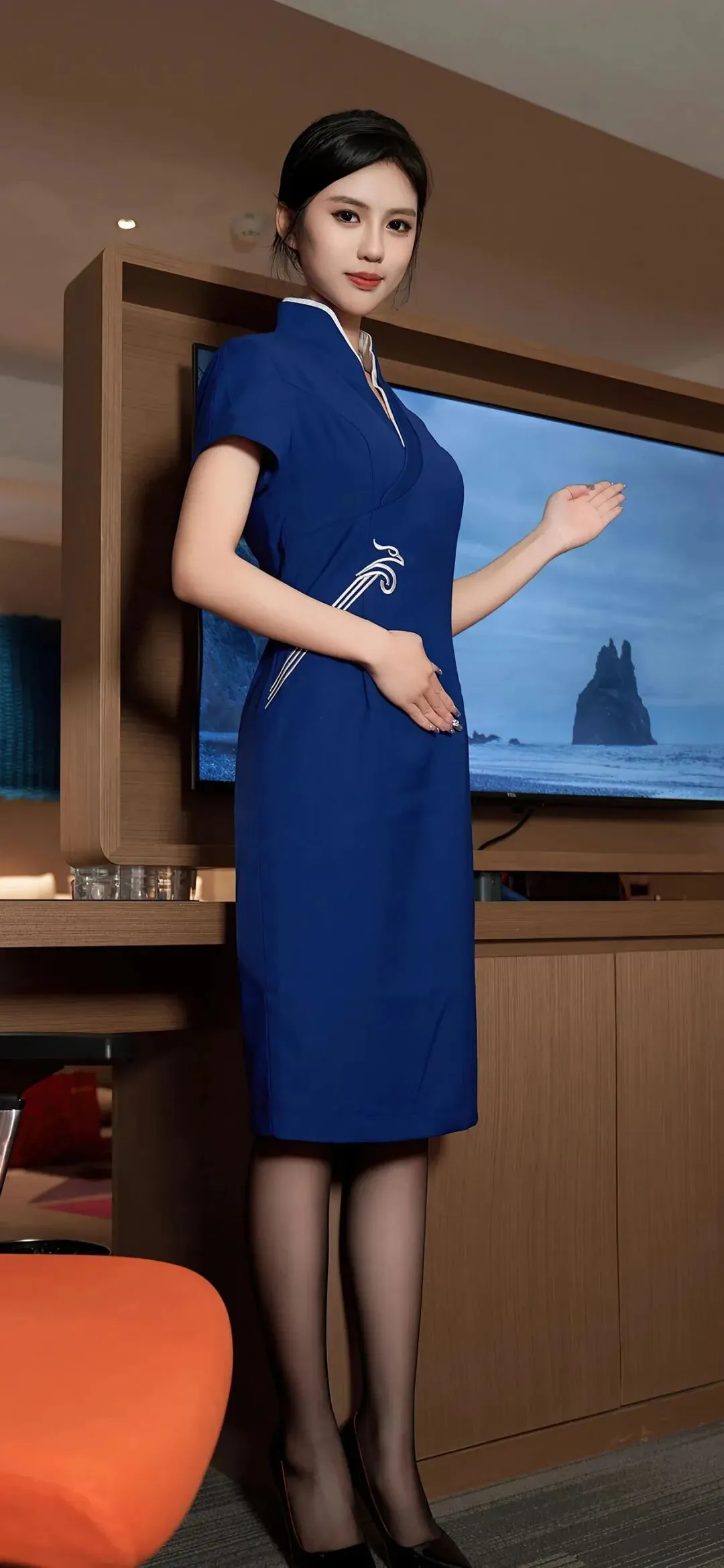 当干练的宝蓝色裹住曲线,职场与温柔的边界便被轻轻打破。她站在暖光里,V 领勾勒出利落线条,腰间的银线纹样像藏着未说出口的故事,黑丝与红底鞋的碰撞,把轻熟御姐的氛围感拉到极致。没有过度暴露的刻意,只有藏在细节里的高级感,每一个眼神都带着禁欲系的张力,让人忍不住想靠近,又怕惊扰了这份恰到好处的心动。