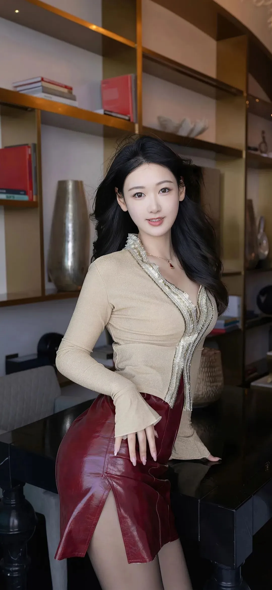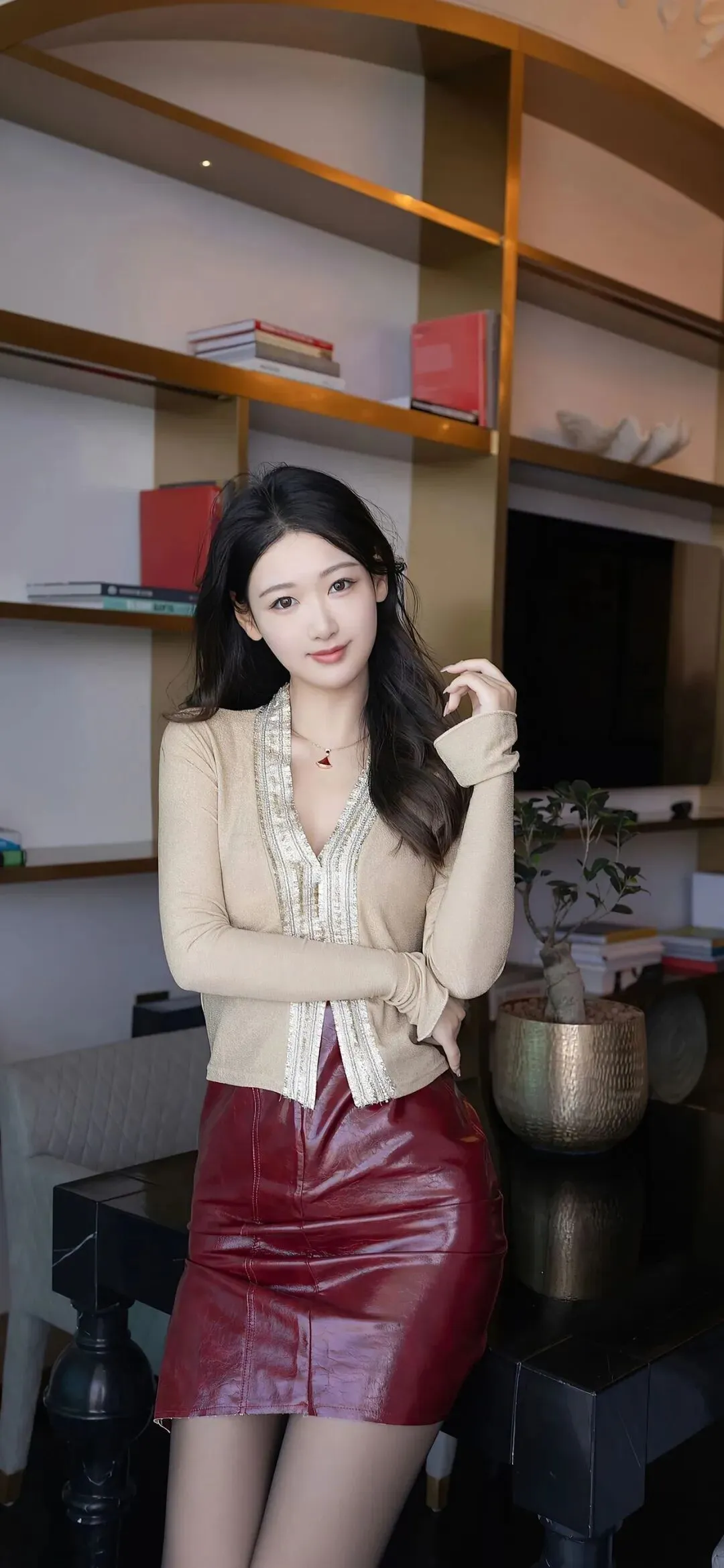 有人说,真正的性感从不是张扬的炫耀,而是藏在衣料褶皱里的气质。这件暖金针织衫用细腻闪丝衬出温柔光泽,镶钻 V 领恰到好处地勾勒线条,而酒红皮裙则用利落剪裁包裹曲线,侧开叉设计露出纤细腿部,黑丝的朦胧感为这份干练添了几分妩媚,红底鞋的点缀则让整体多了一丝明艳的攻击性,刚柔并济的美感,轻易戳中人心。