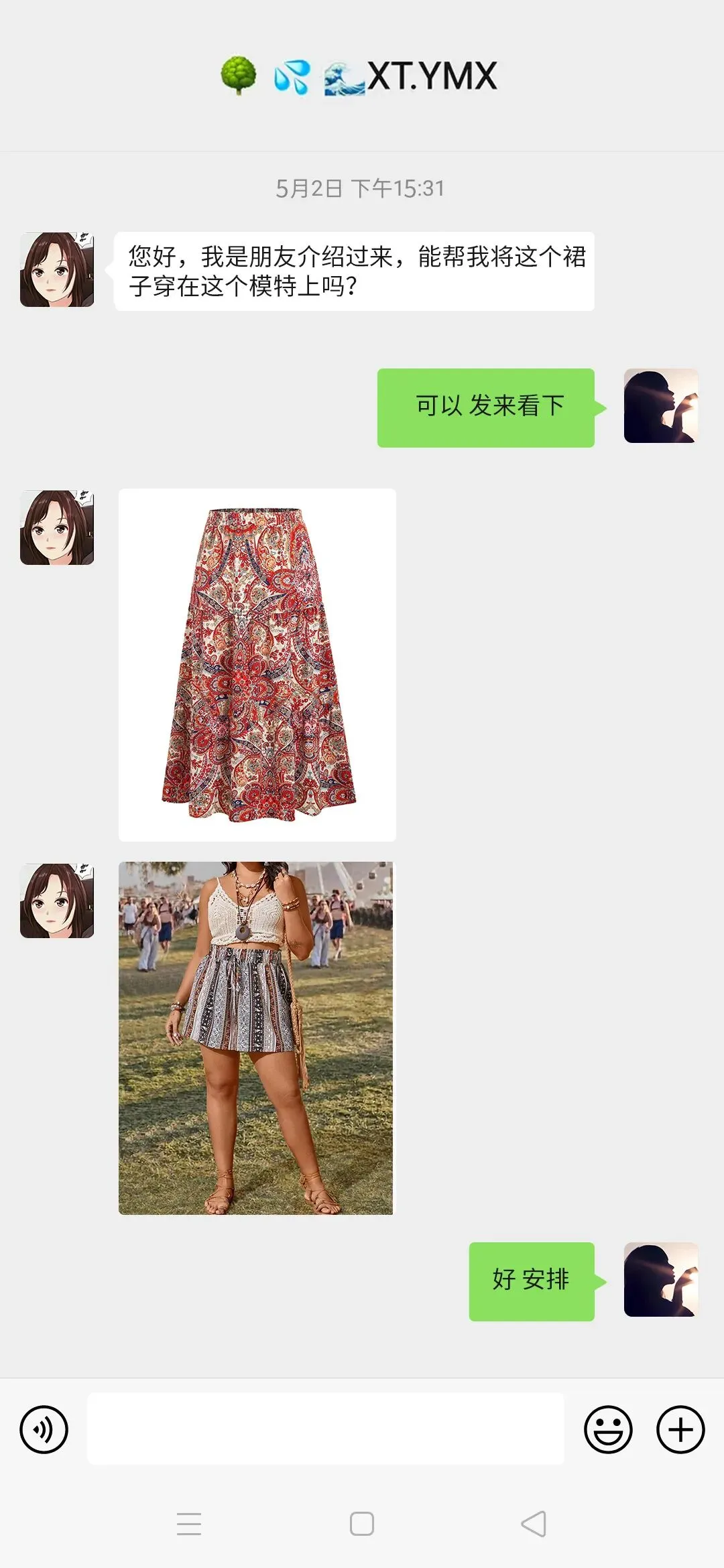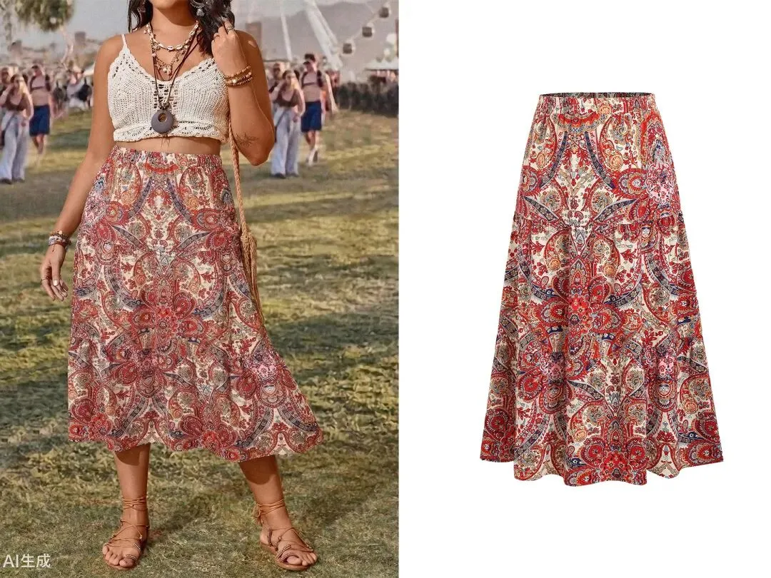 我拿这张图为例,碎花半身裙穿在模特身上AI展示效果。