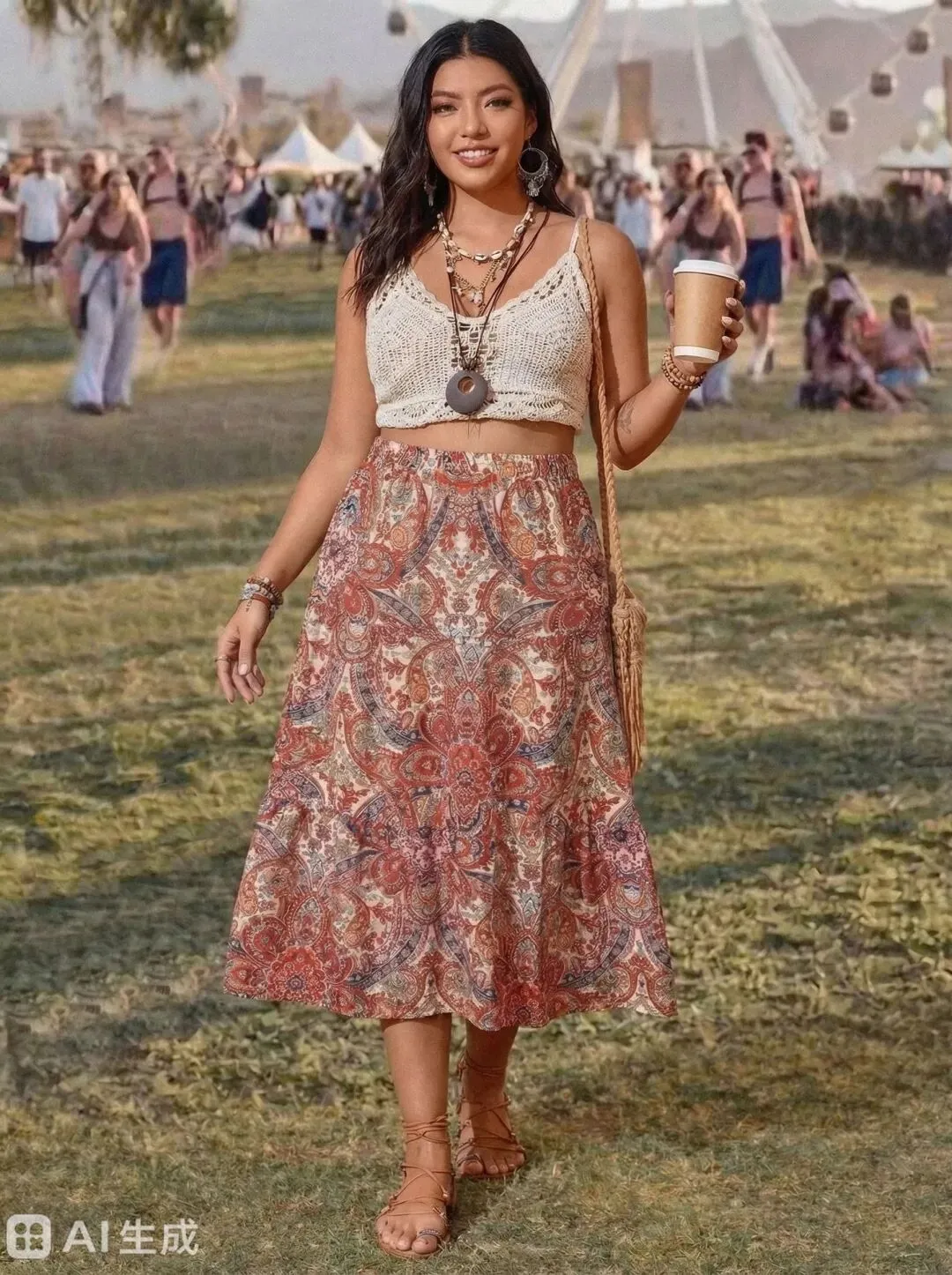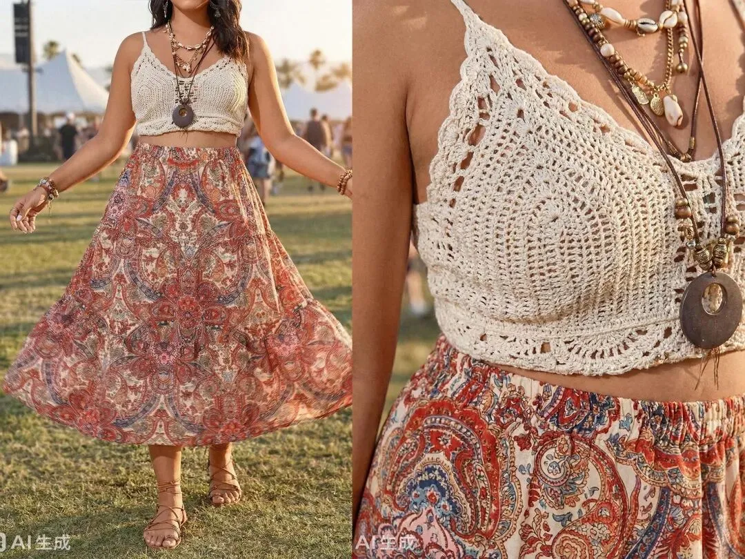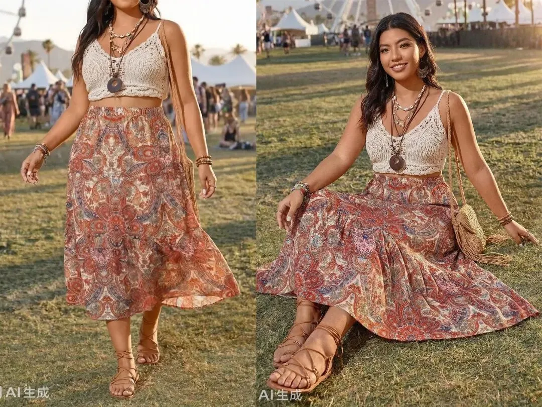 模特在草地音乐节背景下,右图是碎花半身裙,左图是穿在模特身上效果。