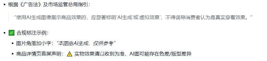 在利用AI生成图像展示商品时,务必显著标明“AI生成”或“虚拟效果”,以避免让消费者误以为是真实穿着效果。