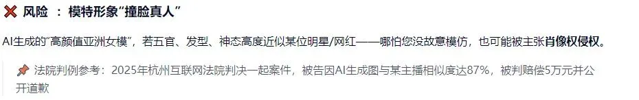 即使是虚拟模特形象,若高度近似某真人,也可能面临肖像权侵权的风险。为安全起见,推荐使用完全虚构的人脸或采用去标识化处理,并在产品页标注相关信息。