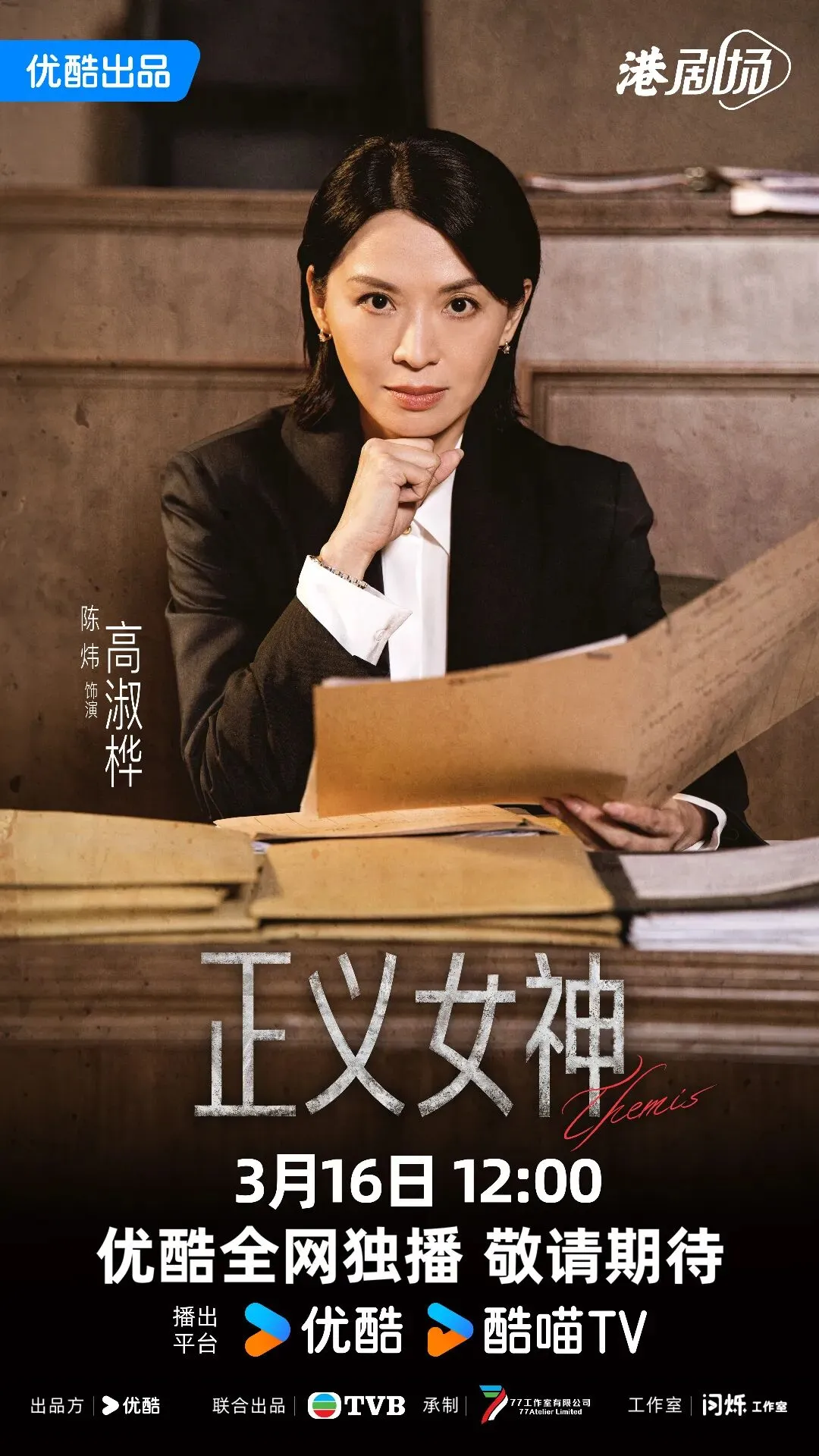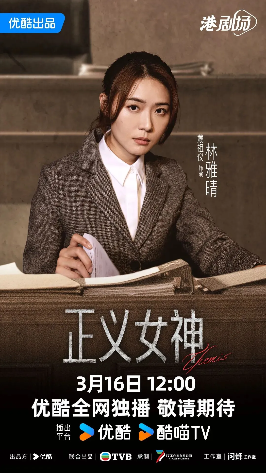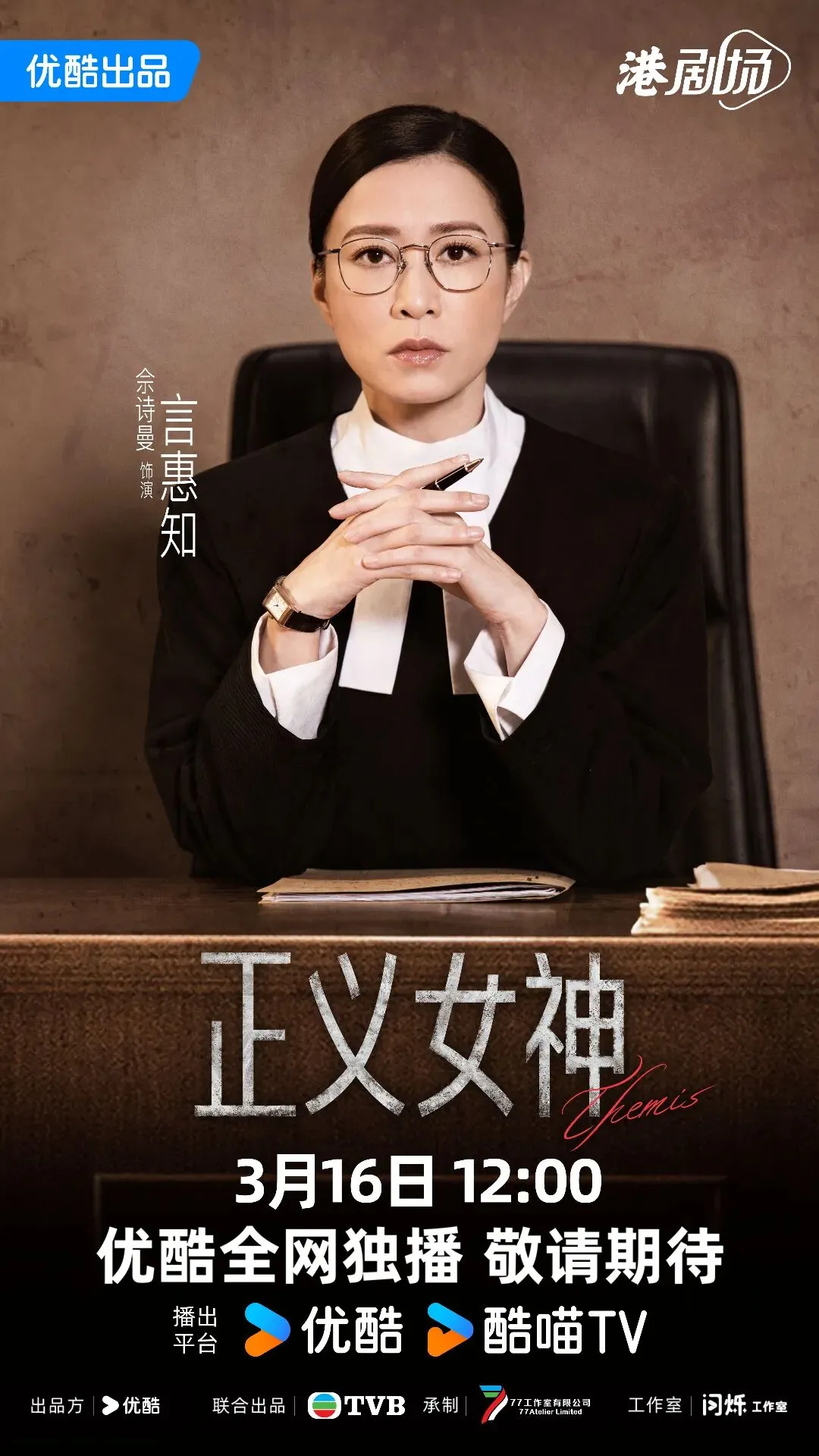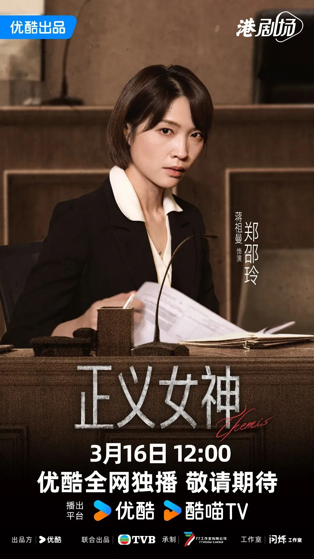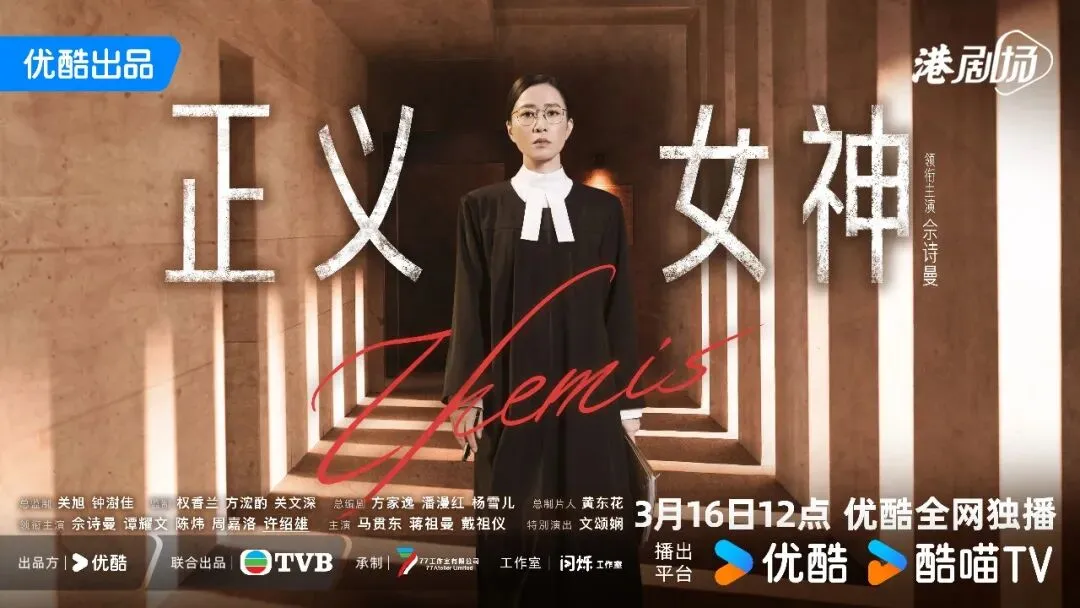 由优酷、TVB联合出品,TVB77工作室制作的现实题材律政力作《正义女神》今日正式官宣定档,3月16日12:00优酷港剧场全网独播!该剧由孟钧、许涛担任出品人,关旭、钟澍佳担任总监制,权香兰、方浤酌、关文深担任监制,方家逸、潘漫红、杨雪儿担任总编剧,佘诗曼、谭耀文、陈炜、周嘉洛、许绍雄领衔主演,马贯东、蒋祖曼、戴祖仪主演,文颂娴特别演出,剧集聚焦未成年犯罪与司法保护,以港剧硬核尺度与现实深度,开启律政题材全新表达。