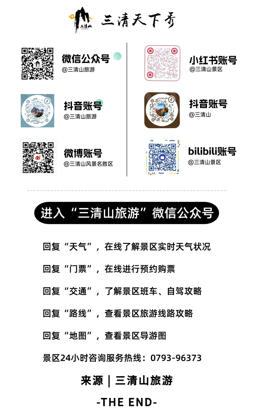 Ps:节假日高峰时段景区入园可能会有提前或延后,请旅客们关注「三清山旅游」微信公众号,及时获取景区咨询。