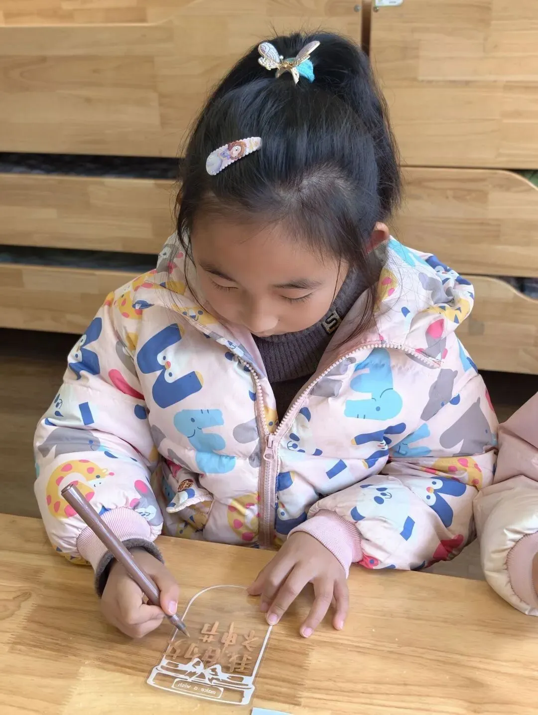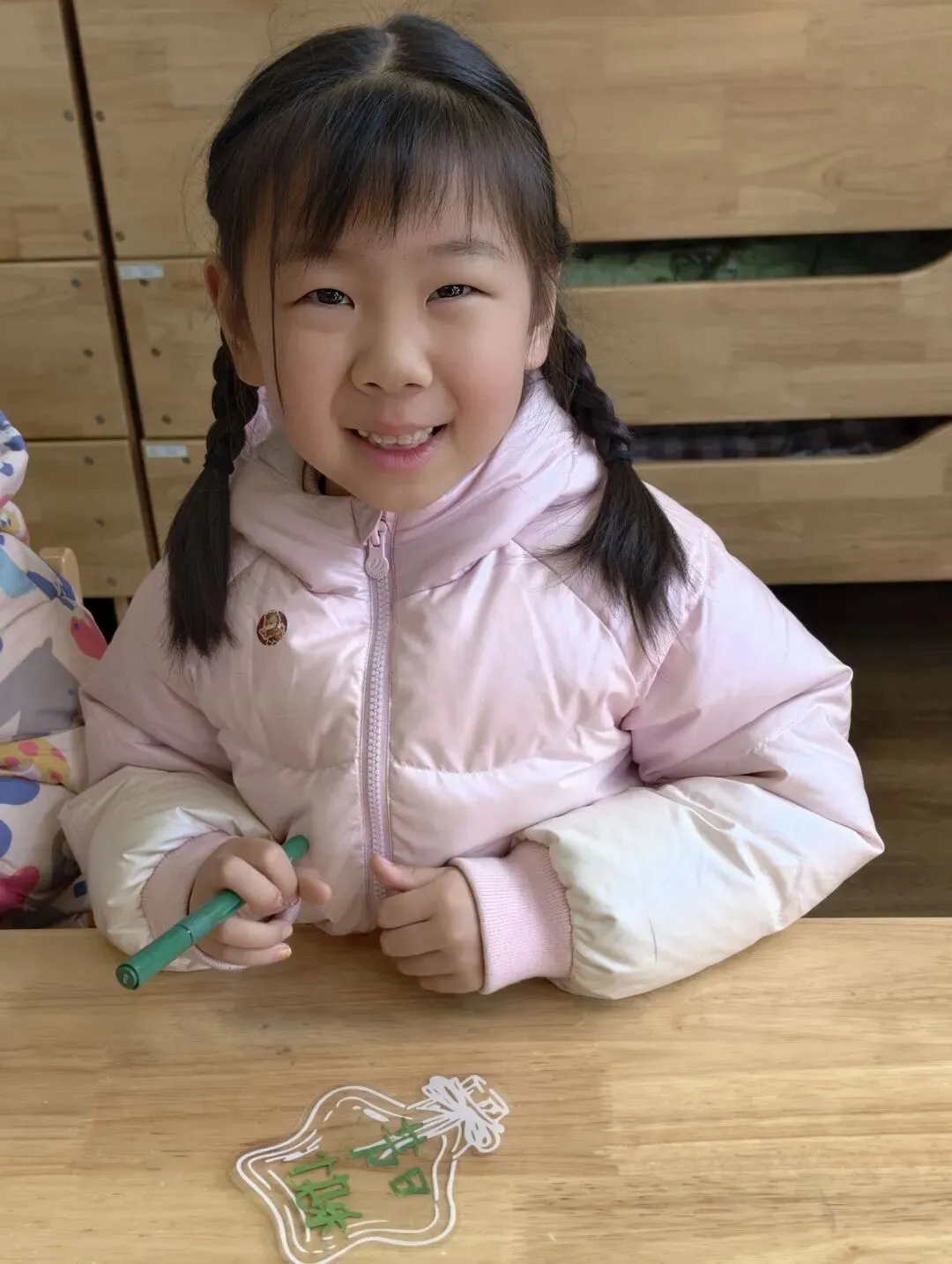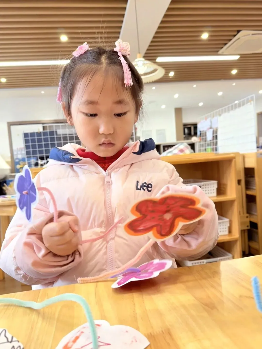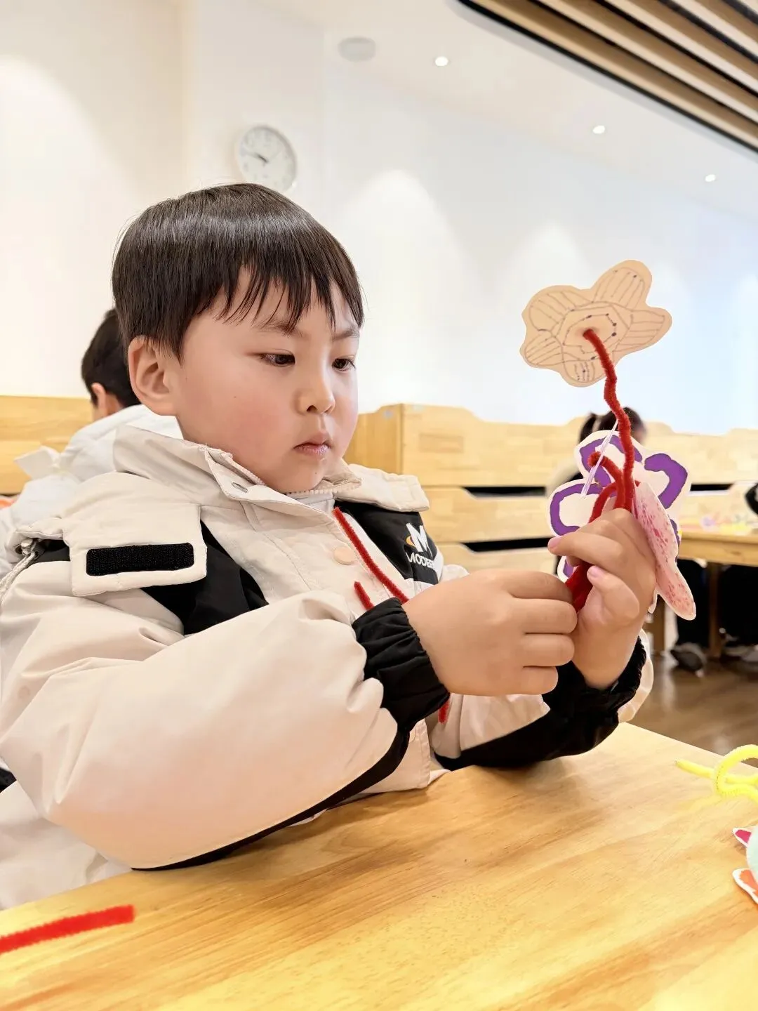 大三班小朋友们用自己稚嫩的双手将彩色黏土揉捏成朵朵小花,小心翼翼地粘贴在半透明卡片上。这份特别的礼物,承载着孩子们最纯粹的爱与祝福,献给妈妈、外婆、奶奶们,祝愿她们如春花般灿烂,如春光般温暖。
