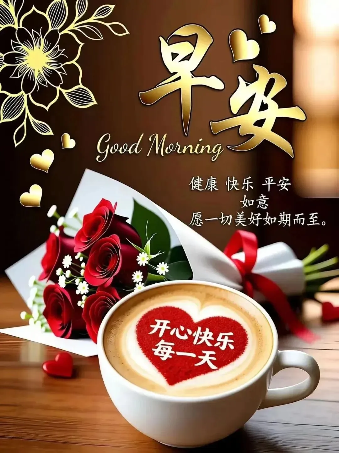 新的一天,精神饱满,打个招呼,幸福美满,微信传递你我平安;真诚祝福,事事圆满,祝福我们健康平安每一天!早安吉祥!🌹🙏❤️☕️🎉