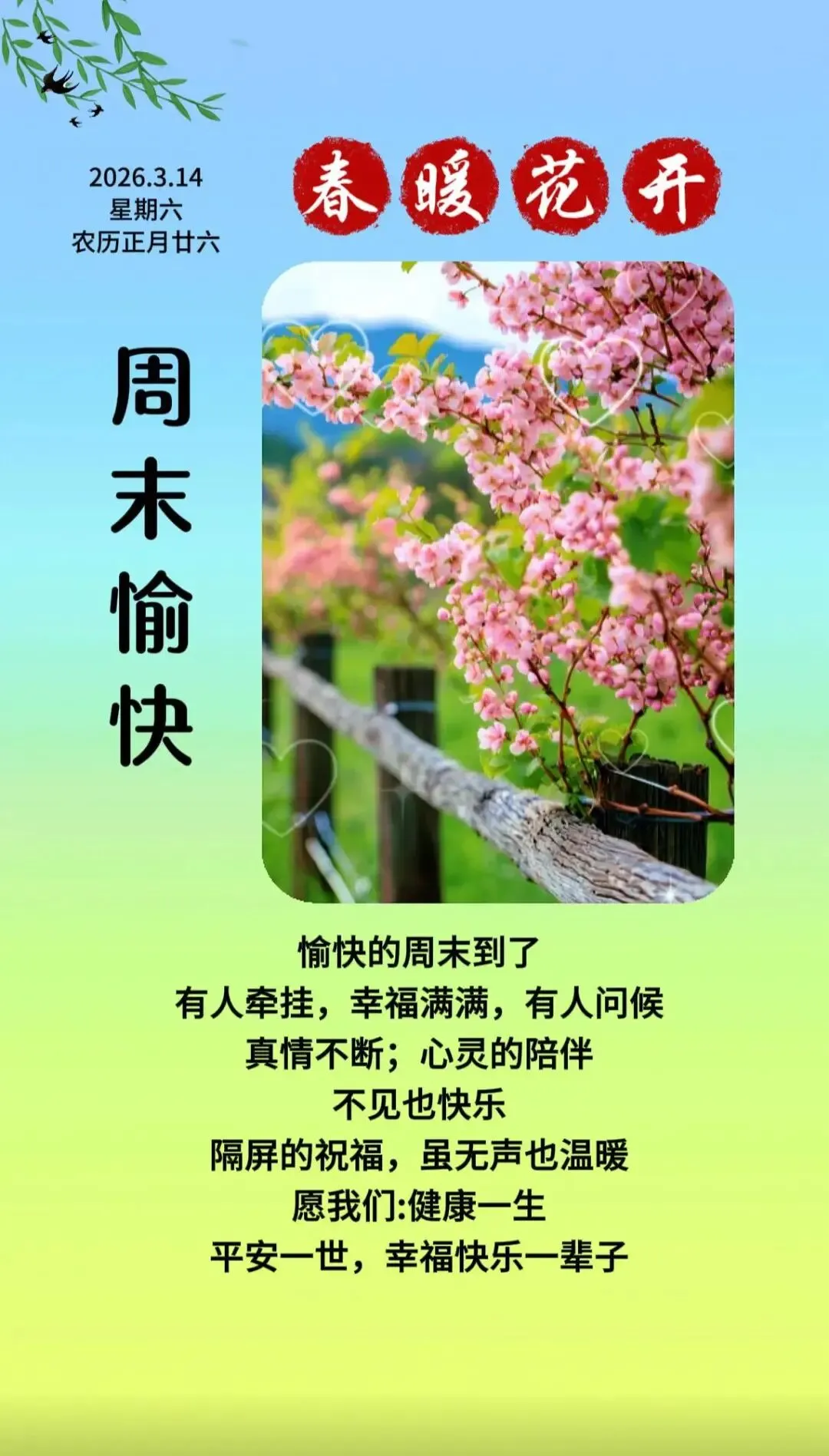 青山绿水百花艳,各居一方微信见;每天互道一声安,捎去祝福及思念;但愿彼此多保重,健康快乐每一天。早上好!