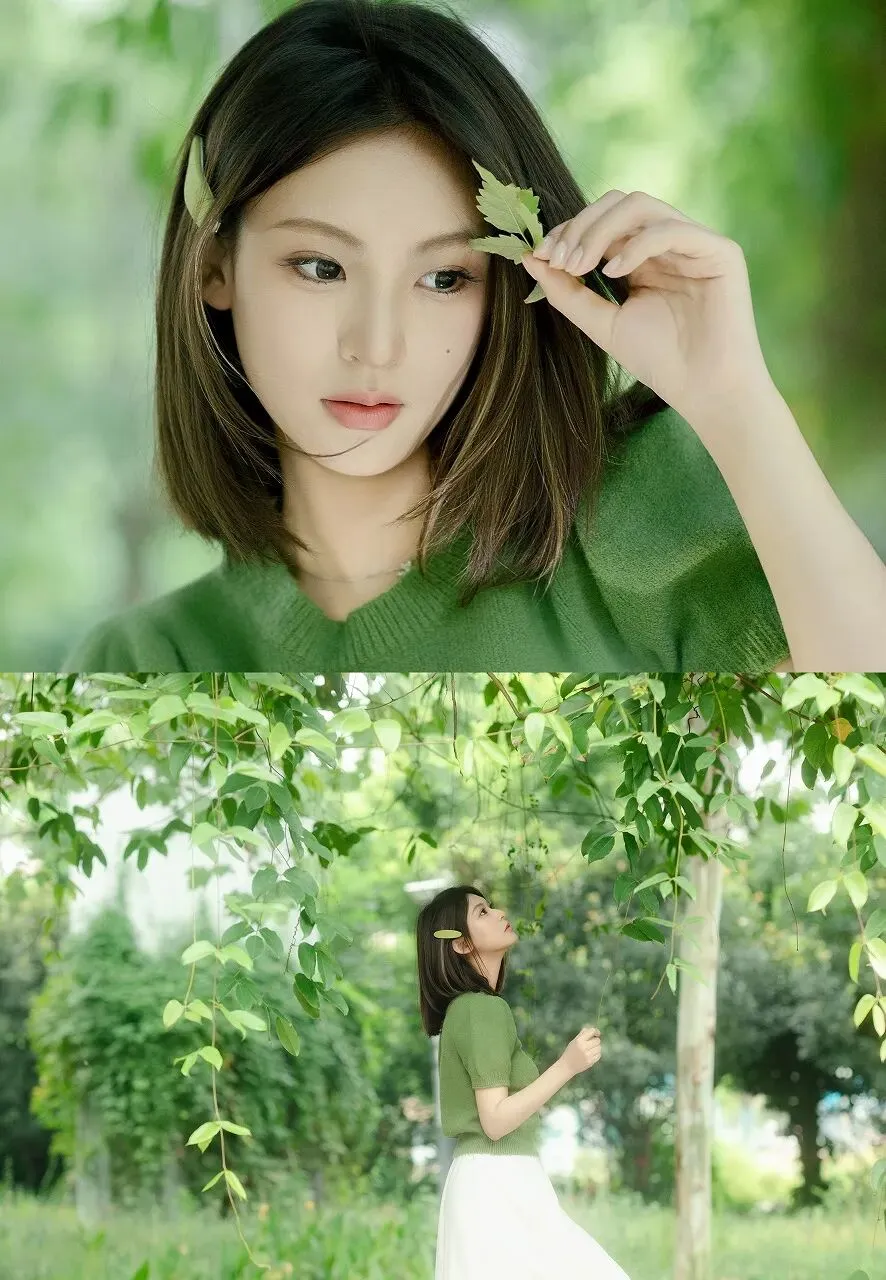 在繁华都市的喧嚣背后,我们总在寻觅一方能让心灵栖息的净土,一处能重拾宁静与纯真的所在。而当目光与这位手持绿叶的少女相遇,仿佛瞬间踏入了一片清新的绿野,所有的浮躁与疲惫都渐渐消散。少女身着一件柔和的绿色上衣,那绿,宛如春日里初绽的新芽,充满生机与希望。衣服的材质看起来柔软舒适,贴合着她的身形,散发着一种自然随性的气息。她的头发是齐肩的长度,柔顺地披散在肩头,发间别着一片小巧的绿叶发卡,与手中的绿叶相呼应,仿佛是从大自然中撷取的精灵,为整体造型增添了一抹灵动的俏皮。她手持几片鲜嫩的绿叶,手指轻轻捏着叶柄,绿叶的脉络清晰可见,仿佛在诉说着生命的奥秘。少女的眼神清澈明亮,如同山间的一泓清泉,透着纯真与好奇。她的嘴唇微微抿起,带着一丝淡淡的恬静,仿佛在思索着大自然的美好。她的肌肤白皙细腻,在绿色衣衫的映衬下,更显晶莹剔透,仿佛散发着淡淡的光泽。