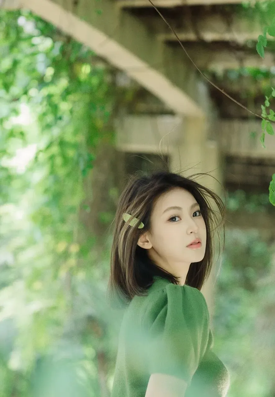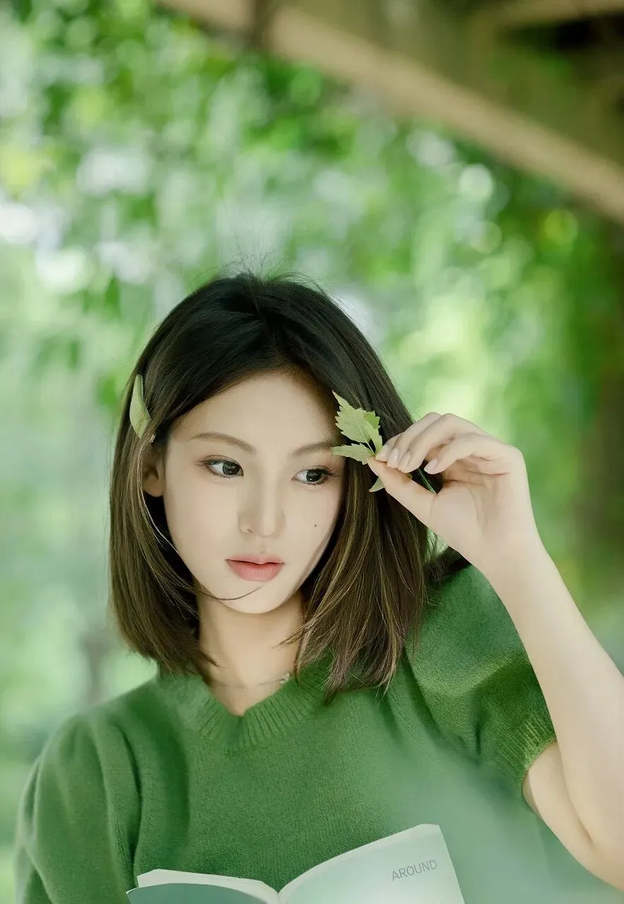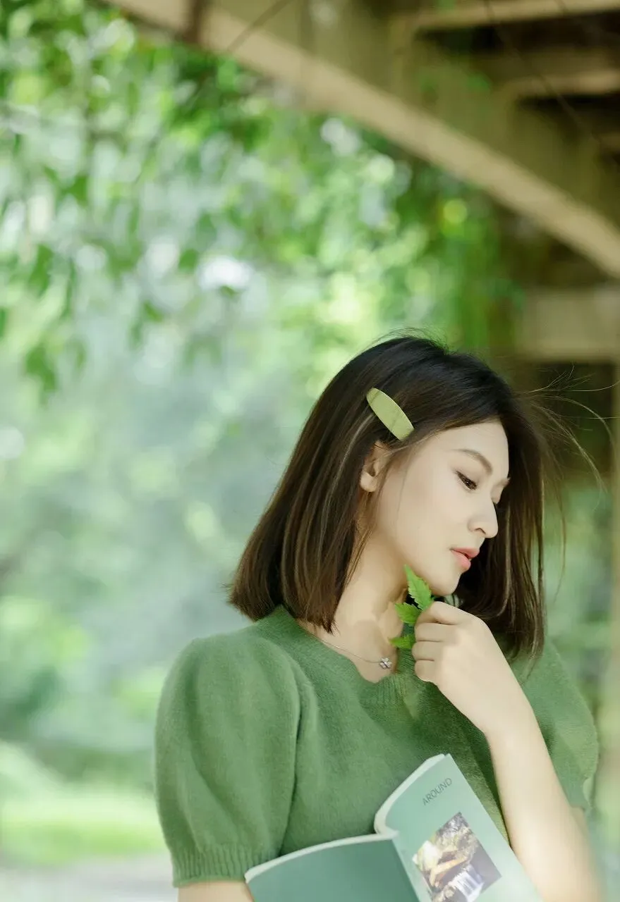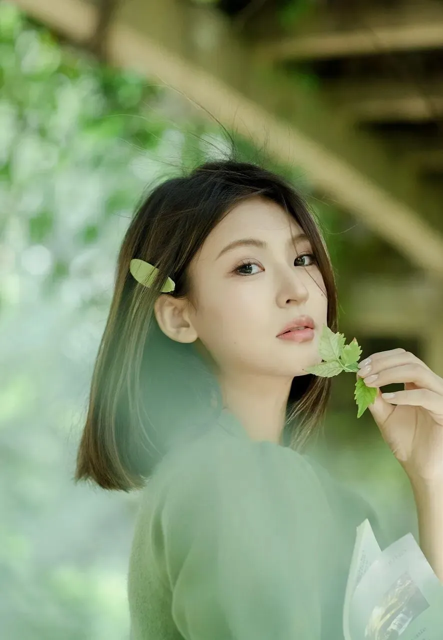 背景是一片绿意盎然的景象,模糊的绿色植物和木质结构营造出一种朦胧而梦幻的氛围。阳光透过枝叶的缝隙洒下,形成斑驳的光影,为整个画面增添了一份温暖与诗意。少女仿佛与这背景融为一体,成为了大自然的一部分,展现出一种和谐而美好的画面。绿色,是大自然最慷慨的馈赠,它象征着生命、希望与活力。当少女身着绿衣,手持绿叶出现在画面中,她就像是大自然的使者,将那份清新与纯净带到了我们面前。在这个被钢筋水泥包围的时代,我们离大自然越来越远,心灵也渐渐变得麻木。而这位少女的出现,让我们重新感受到了大自然的魅力,唤醒了我们内心深处对自然的热爱与向往。她的美,不仅仅在于外表的清纯甜美,更在于她与自然的融合所散发出来的那种宁静与和谐。她没有刻意地摆姿势,也没有夸张的表情,只是自然地手持绿叶,眼神中透露出对周围世界的好奇与喜爱。这种自然流露的美,是最真实、最动人的。就像大自然中的花朵,无需修饰,却能绽放出最绚烂的光彩。