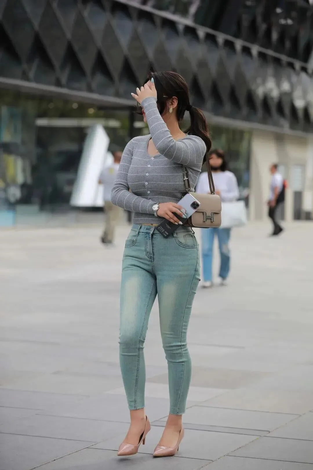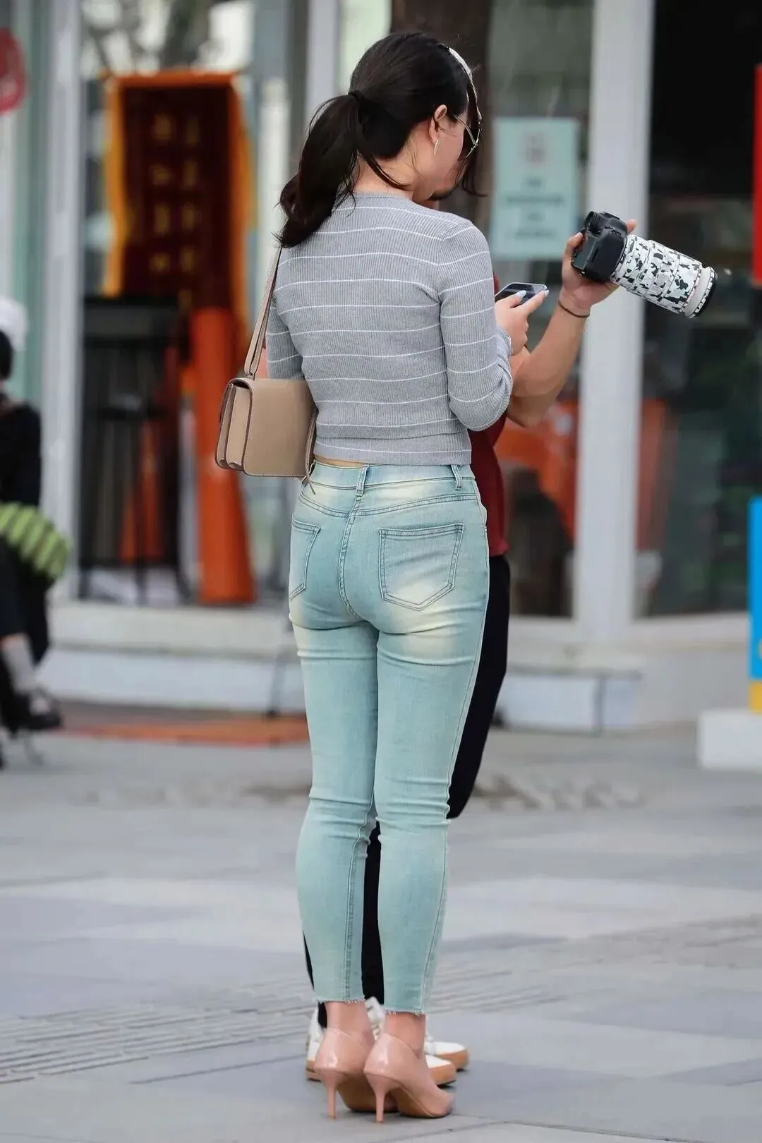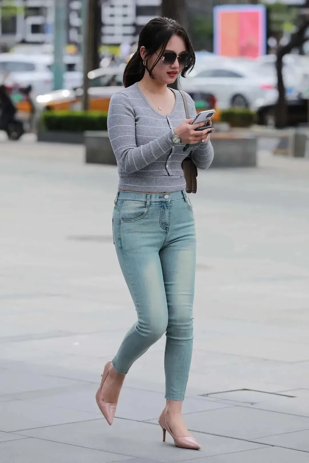 裤子是条浅蓝色的紧身牛仔裤。颜色水洗得自然,不会太新也不会旧旧的。高腰版型腰围收缩非常紧实,臀部线条也更明显了。九分长度正好露出脚踝,高跟鞋的配合使腿长直接一米八,裤脚有一点毛边,增加了几分随性感,不会太过死板。