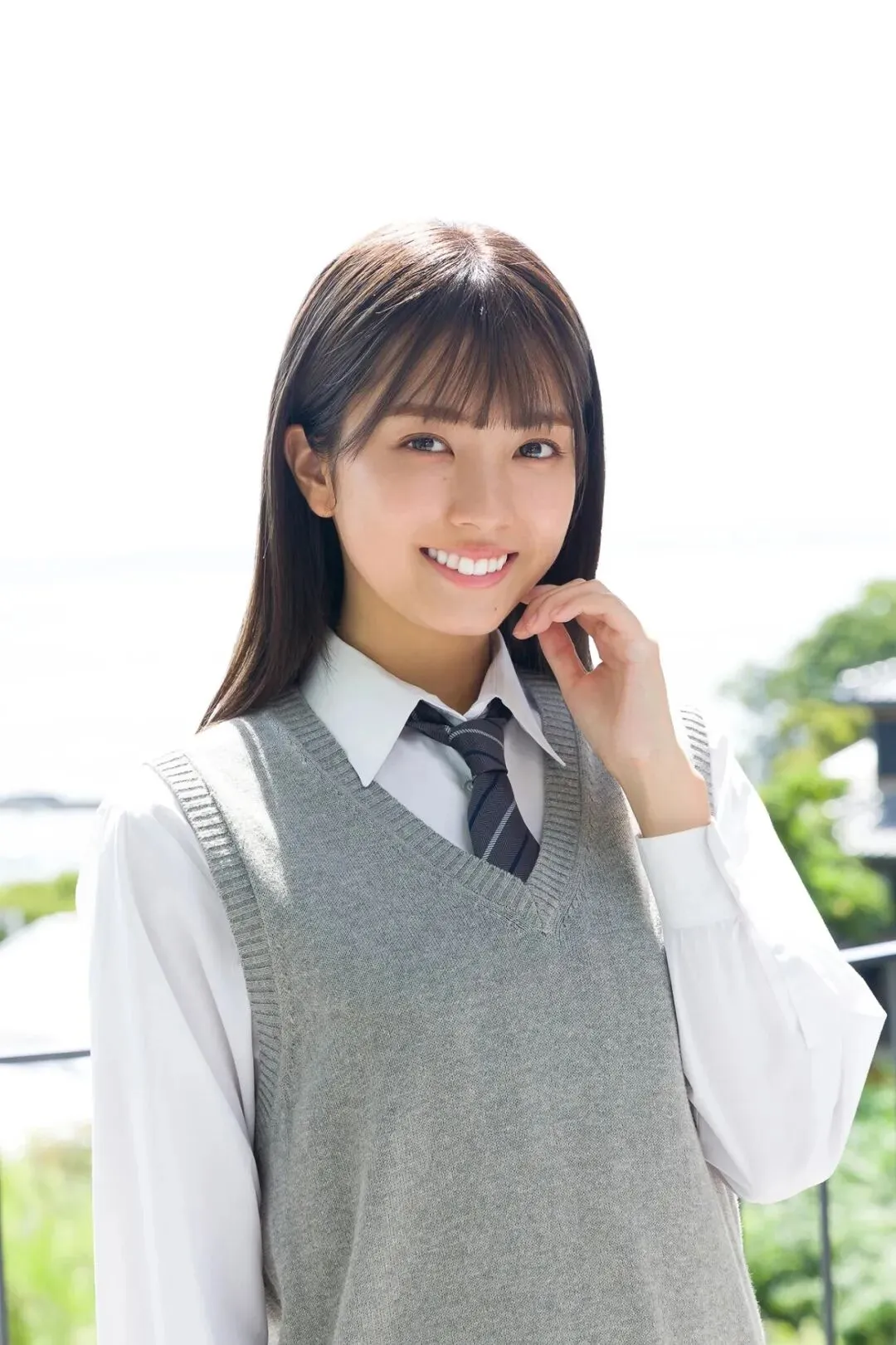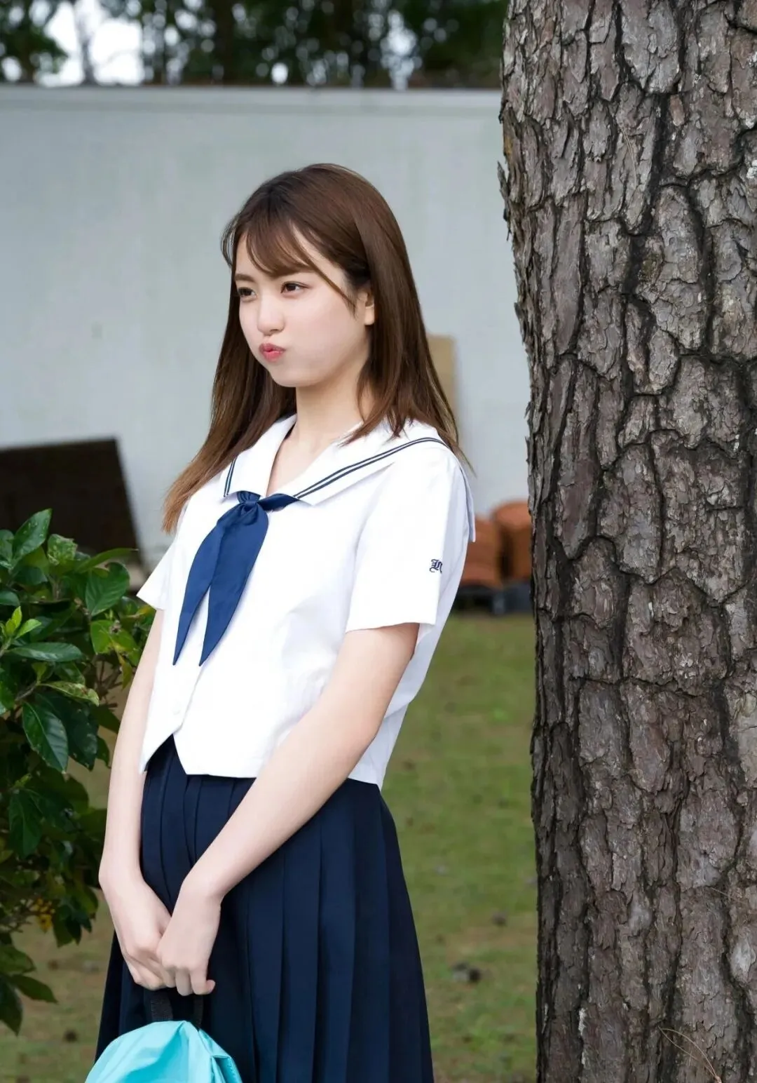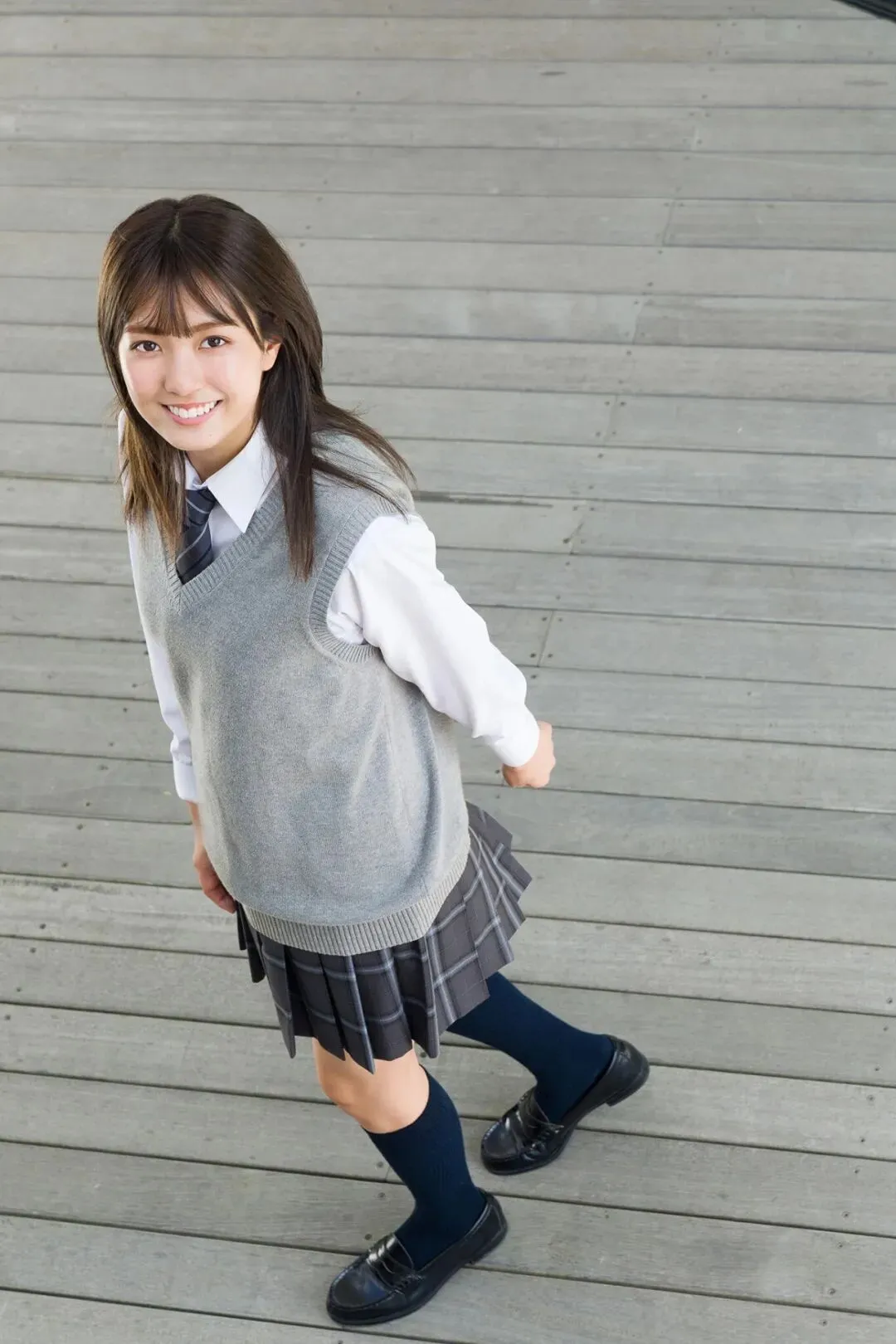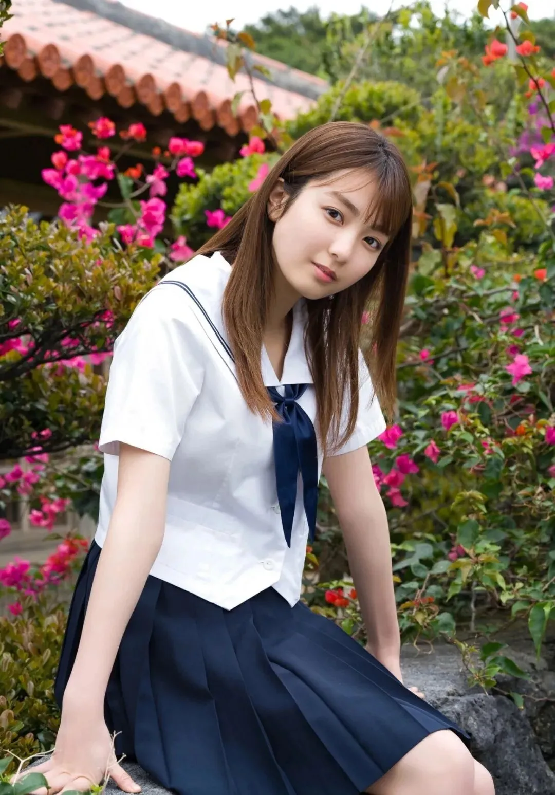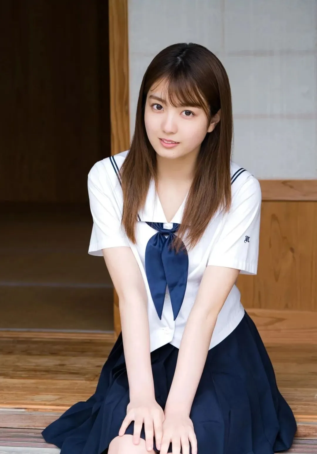作为《Popteen》专属模特出道,她的镜头表现力堪称满分。水手服造型是她的经典标签,洁白短袖搭配深蓝领结,百褶裙随风轻摆,柔顺长发垂落肩头,跪坐在木质地板上的模样,像从校园漫画里走出来的女主角,端庄又乖巧。