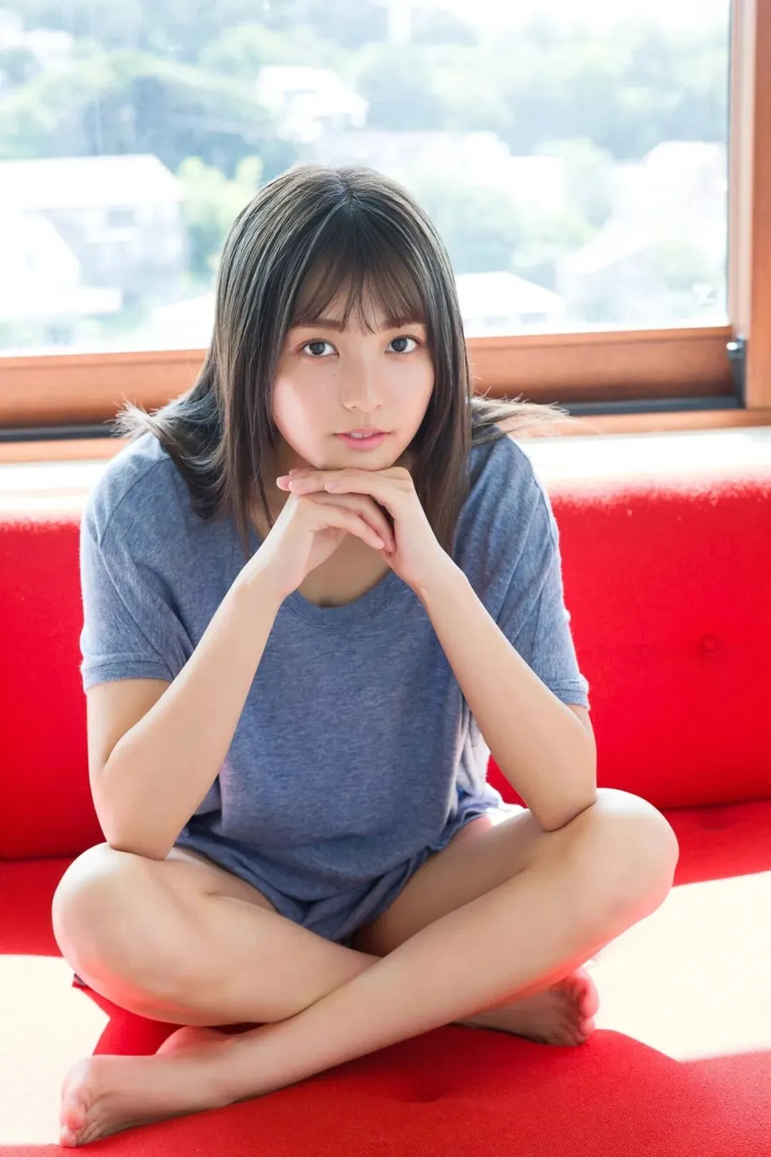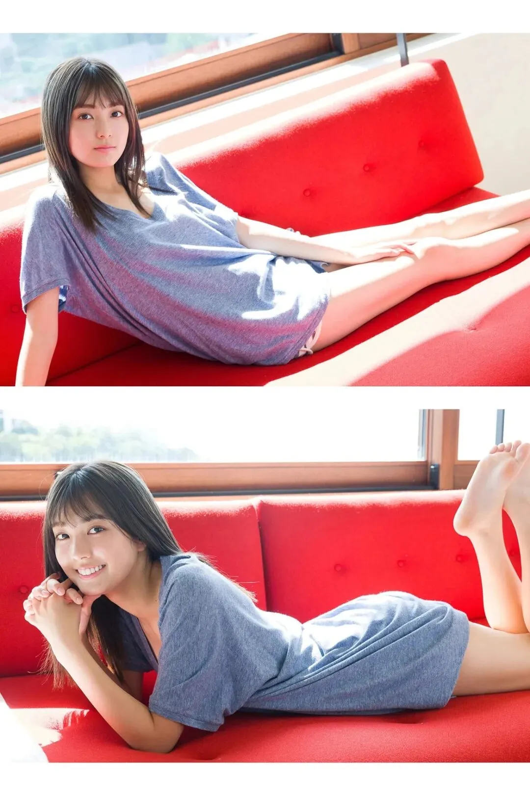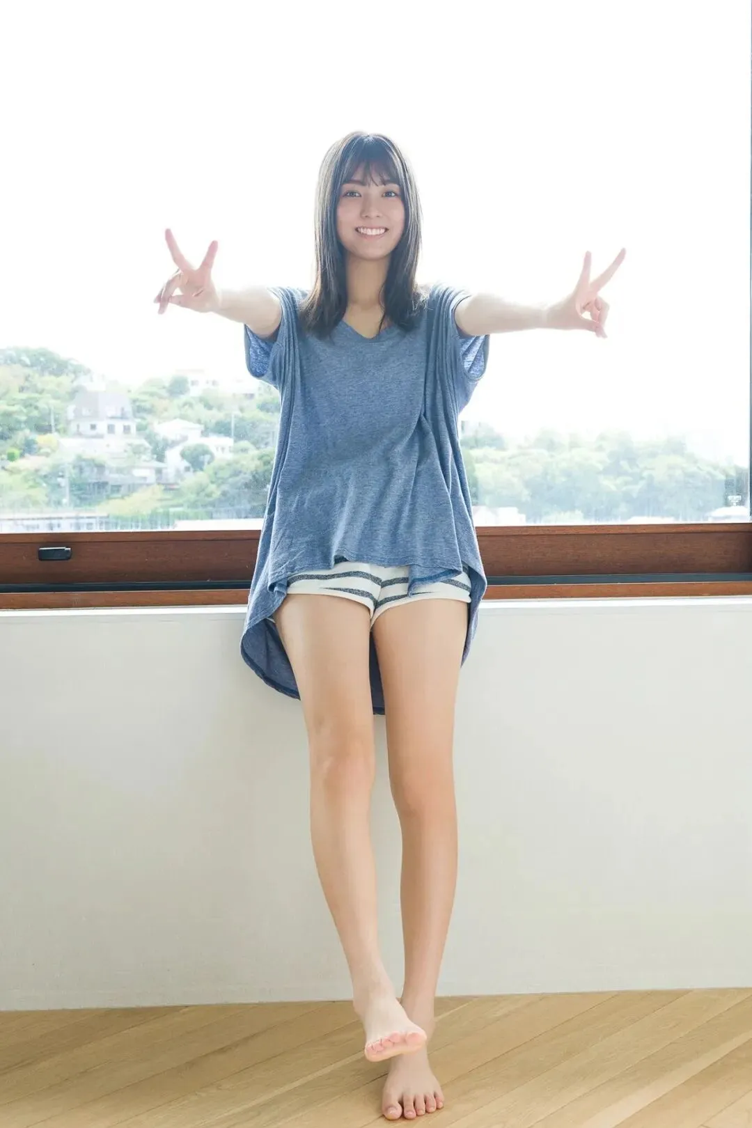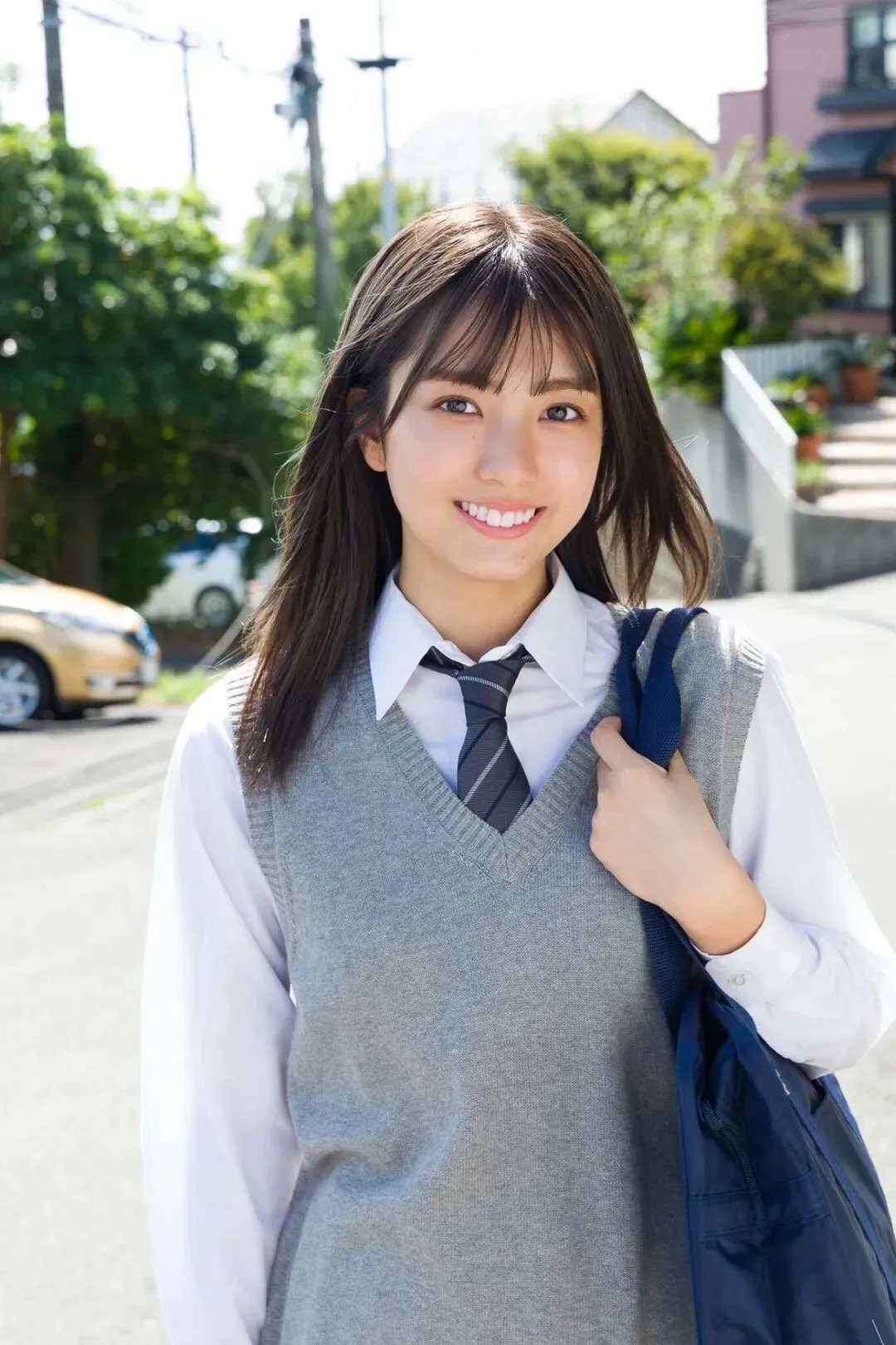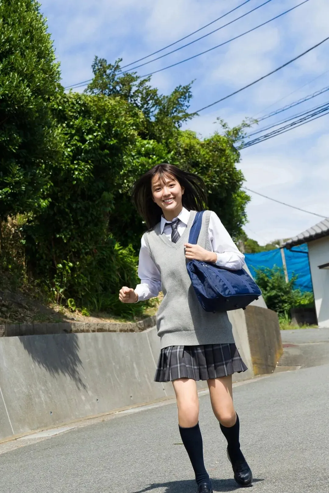 作为《Popteen》专属模特出道,她的镜头表现力堪称满分。水手服造型是她的经典标签,洁白短袖搭配深蓝领结,百褶裙随风轻摆,柔顺长发垂落肩头,跪坐在木质地板上的模样,像从校园漫画里走出来的女主角,端庄又乖巧。
