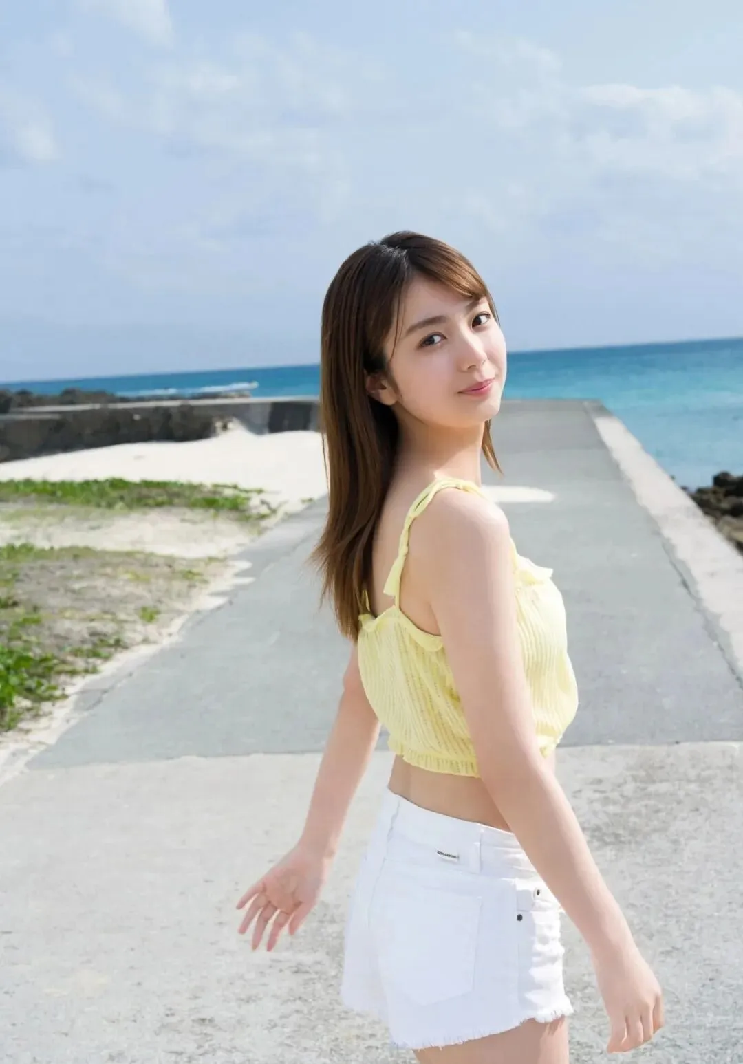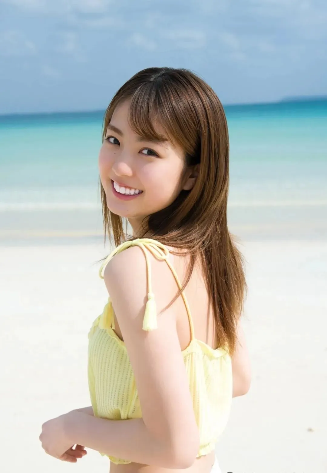 而当她换上泳装,又瞬间切换活力模式。冲绳海滩的阳光下,明黄色泳装衬得她肌肤更显通透,身姿舒展自然,没有刻意的摆拍感,满是阳光与青春的气息,被媒体赞为“洋溢着治愈的透明感”。