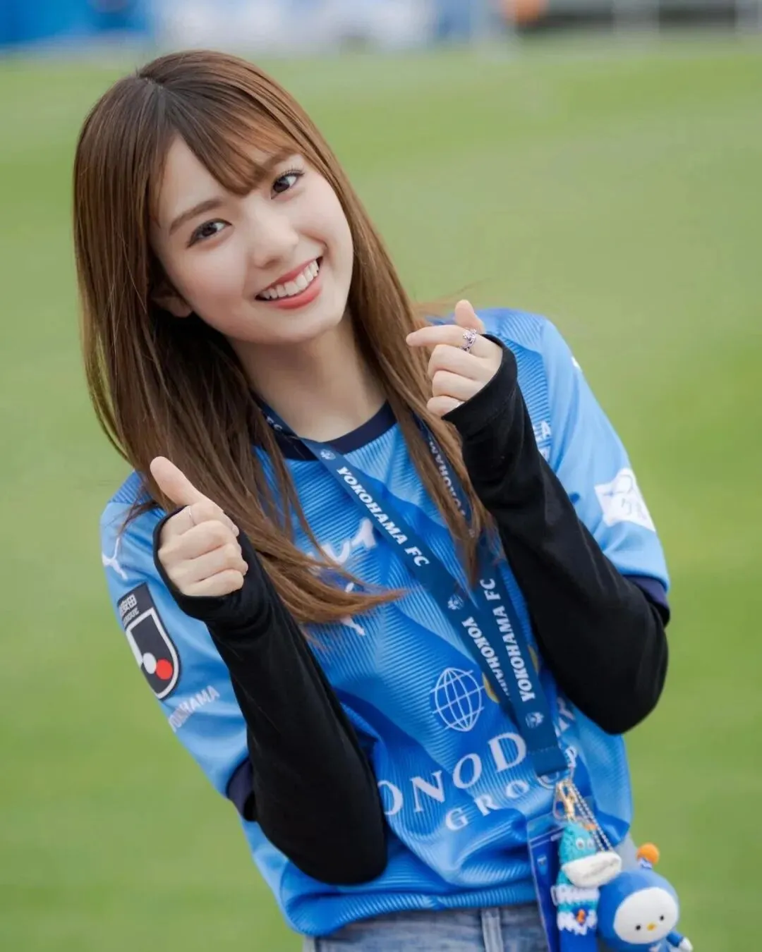 2022年起,她担任J联赛横滨FC主场MC,16岁的年纪,却能轻松掌控全场氛围。球队低谷时,她始终坚守,用活力与热情为球队助威,被球迷亲切称为“胜利女神”。她还曾穿着制服搭配乐福鞋,利落完成足球花式颠球,灵动又元气,让不少球迷成为她的忠实粉丝。