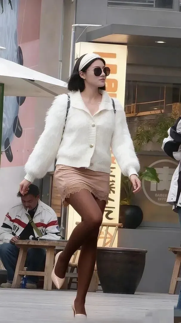 转身一看又是不一样的感受,齐肩短发加短款毛绒上衣,干干净净的。斜挎的黑色皮包是亮点,链条随意又高级。浅卡其蕾丝短裙与丝袜搭配得恰到好处,裸色高跟鞋悄悄地增高,小个子女生穿起来完全没问题。背影都有如此大的气场,细节就加分。