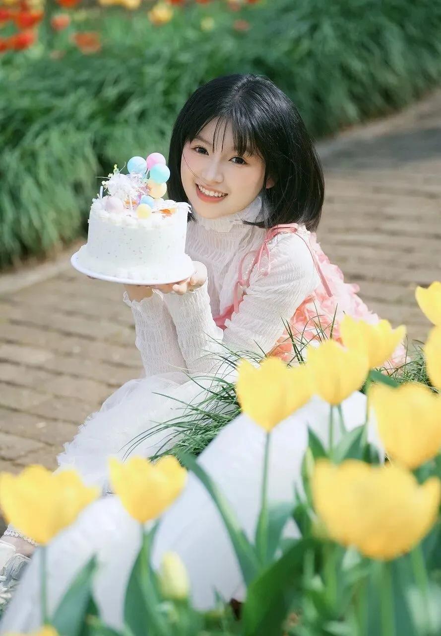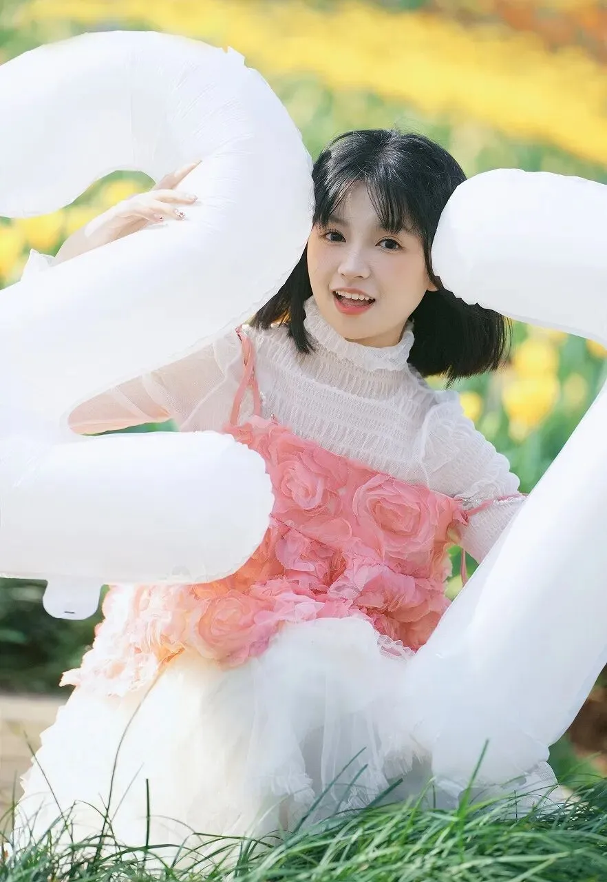 气球的大小几乎与她等高,她却毫不费力地拥抱着,仿佛拥抱着一份巨大的幸福。她的姿态自然而放松,身体微微向后仰,仿佛沉浸在这美好的春日氛围中,享受着这一刻的宁静与喜悦。背景是一片绚烂的黄色花海,花朵密集地排列着,形成了一片金色的海洋。黄色的花瓣在阳光的映照下鲜艳夺目,与少女的白色裙子和粉色装饰形成了鲜明的对比,营造出一种活泼而欢快的氛围。花海在微风中轻轻摇曳,仿佛在为少女的到来而欢快起舞。远处,绿色的植物若隐若现,为整个画面增添了一份自然的生机与活力。春天,是一个充满希望与美好的季节。它象征着新生,象征着活力,象征着一切美好的开始。而这位抱气球的少女,就像是春天派来的使者,带着满满的甜美与喜悦,来到了我们身边。她的出现,让这个春天变得更加生动有趣,让我们感受到了青春的活力与美好。在时尚的世界里,甜美风格一直备受少女们的喜爱。它以柔和的色彩、轻盈的材质和可爱的元素为特点,展现出少女的纯真与浪漫。