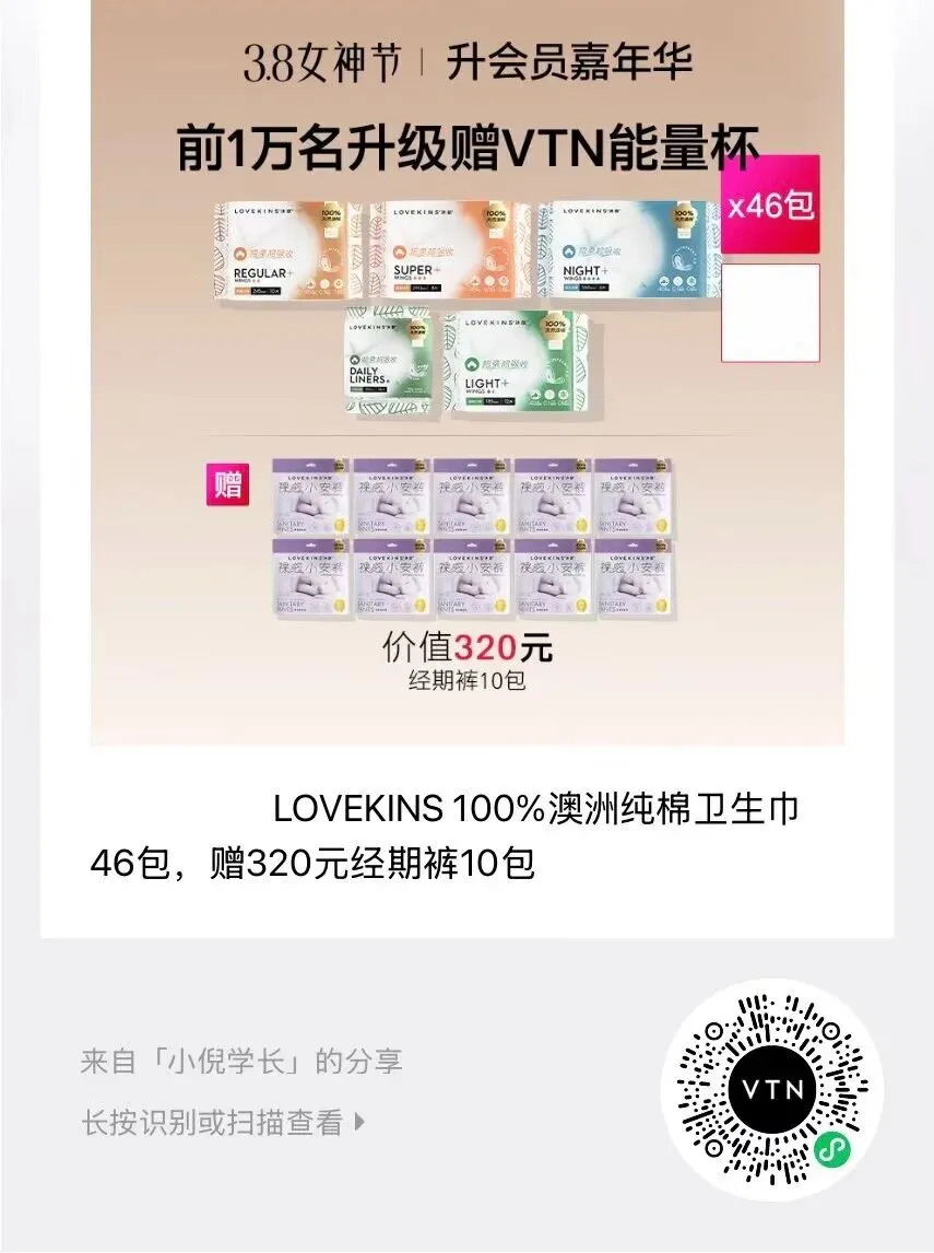 当前位置:首页>美女资讯>VTN3.8女神节-LOVEKINS 100%澳洲纯棉卫生巾46包,赠320元经期裤10包