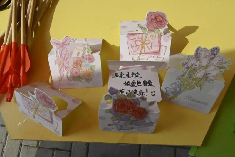 工作人员志愿者们提前精心布置活动场地,各类扭扭棒、花杆、丝带、祝福卡片等手工材料有序摆放。