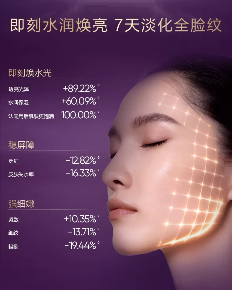 .数据源自上海微谱检测科技集团股份有限公司评估报告(报告编号:SHA01-25091911-JC-01-02)31名中国健康女性受试者使用产品15分钟后,经专业仪器评估显示皮肤光泽度(脸颊)增加89.22%、水分含量CM值增加60.09%,说明透亮、保湿度有改善,实际效果因人而异;